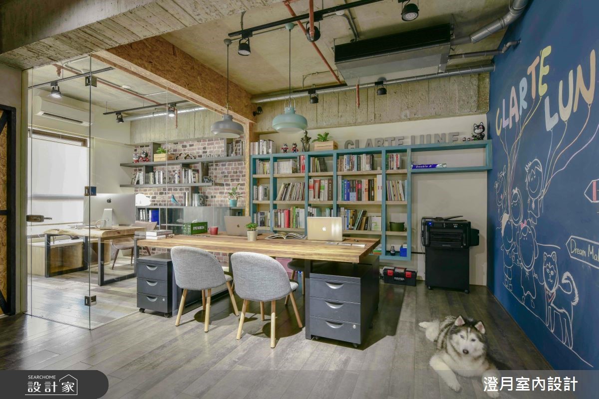屋主期望營造一個舒適又具個性的辦公環境給員工,因此這間 28 坪的 Loft 風空間,在天花板刻意留下原始板模樣貌,搭配仿舊古銅色的消防管線、螺旋風管修飾的冷氣管線,打造粗獷的工業風情。由於室內有養狗的關係,所以特別選用超耐磨木地板及輕盈的家具,讓毛小孩能擁有較大的活動空間。餐廚空間利用 OSB 板裝飾天花,並配合廚具的霧面結晶鋼烤面板,以及點綴綠意的盆栽,塑造清新自然的烹飪區塊,平衡整體空間的冷調。會議室櫃體門片塗上黑板漆,使空間能獲得最大利用,再加上實木會議桌提升溫暖感受。