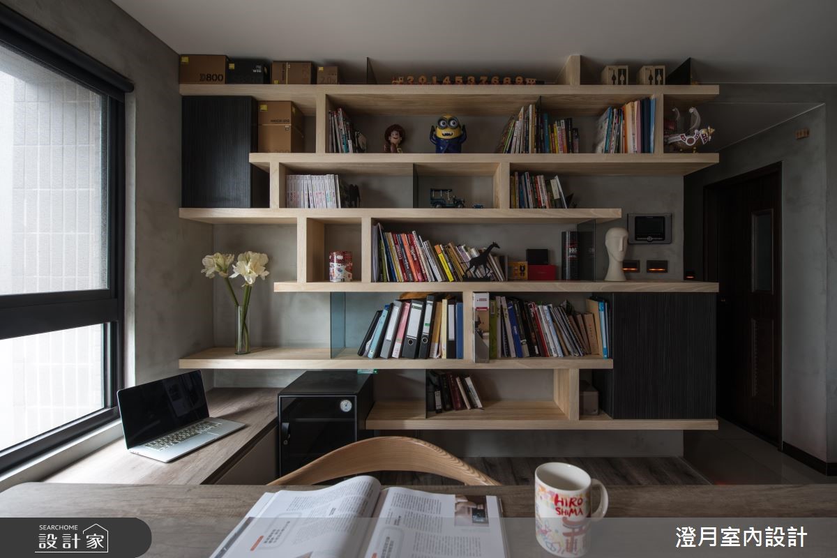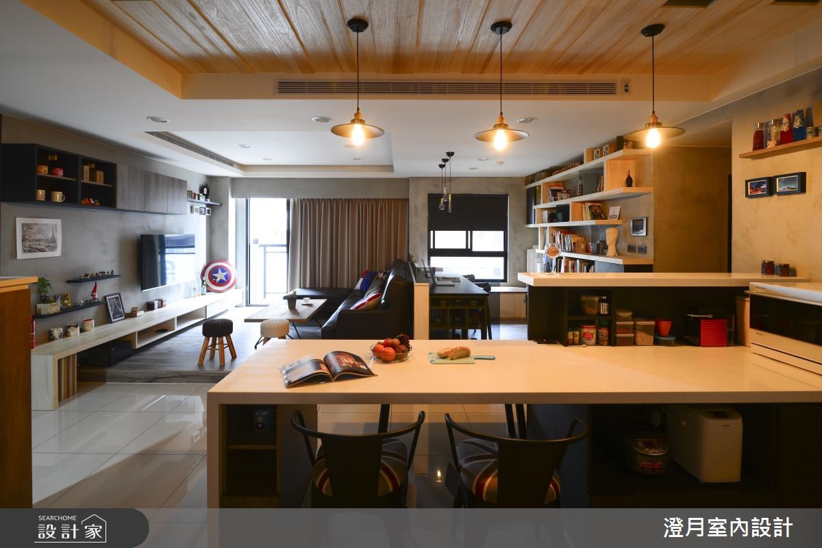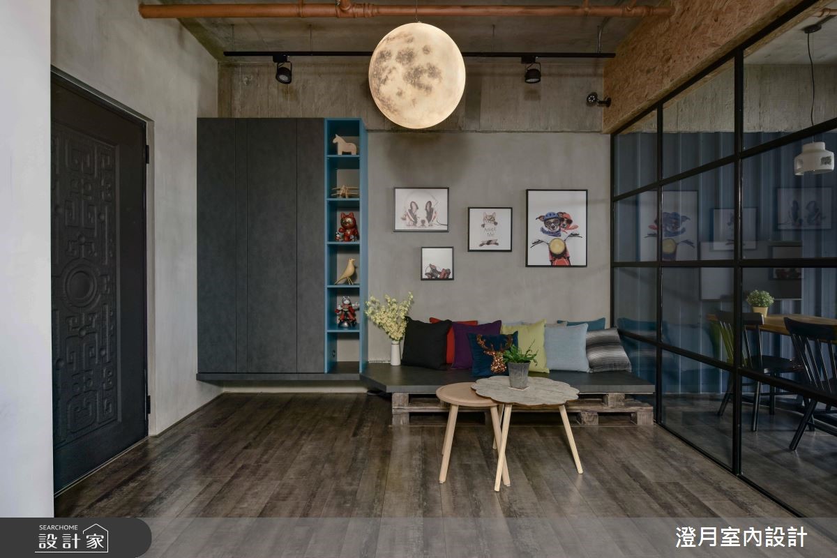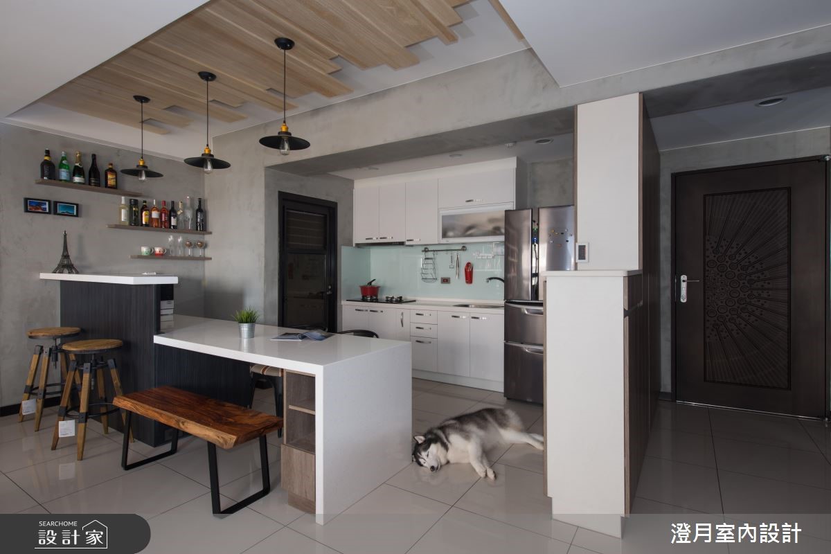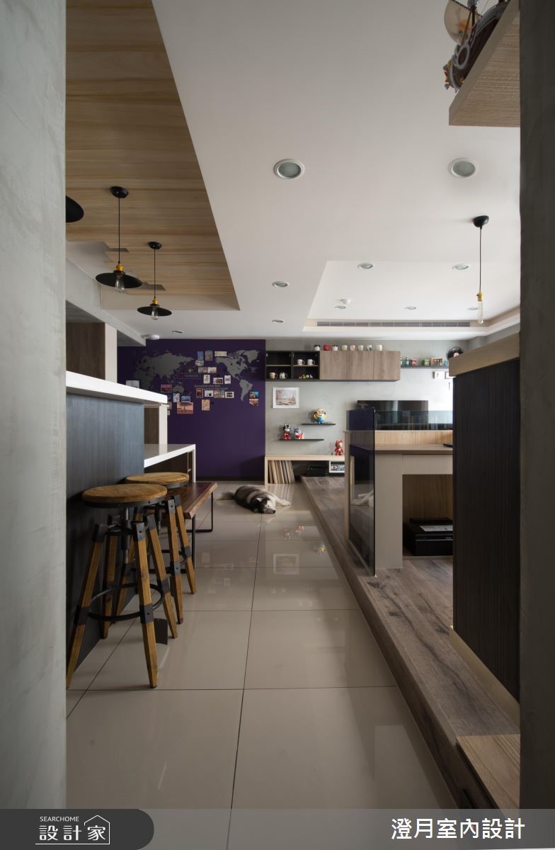 此案是屋主與哈士奇的居家生活,以個性化的Loft風格營造室內氛圍,拆除隔間牆、打造開放領域,並藉由架高木地板拉出領域層次;空間裡透過展示屋主的收藏與喜好,營造出充滿回憶與溫度的日常風貌。 入口右側以鞋櫃界定出玄關與餐廚領域,室內則利用架高木地板串連客廳與書房區,拆除沙發背牆後,形塑開放式書房,讓居家環境變得更寬闊,哈士奇也更能活動自如。電視牆以仿清水模的水泥砂漿做特殊塗料處理,傳遞樸實、個性化的味道,結合木紋收納櫃與展示層板,增添視覺的變化與活潑度,一旁則利用訂製世界地圖輸出壁貼的黑板漆,佈滿屋主旅行時的照片或明信片,讓旅遊的回憶成為一面風格端景牆;考量樑柱結構問題,餐廳的天花板特別以木作拼接方式呈現,且將餐桌與中島串連,滿足屋主平日喜愛烹調的習慣,牆面上搭建高低錯落的層板,陳列著平時收藏或被贈與的佳釀,偶爾小酌一番,或與三五好友相聚談心的催化劑。 小編的最愛 整體空間利用很多層板設計,陳列出屋主成長過程中、不同時期的收藏;書房壁面更設計大面積的開放書牆,滿足大量藏書,並以不同顏色的玻璃造型做妝點,讓視覺更添變化。