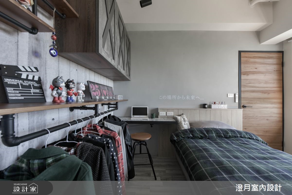 25 坪 Loft風,男屋主鍾情個性工業感,但女屋主並不喜歡過於陽剛的風格,因此設計師透過木質材溫潤特性暈染充滿清水模質感及鐵件的空間,發揮材質本身的特性,完美平衡兩人喜好! 公領域牆面的水泥特殊漆,圍塑整室暗色系工業氛圍,餐廳區側牆地圖壁紙,作為另一視覺亮點外,更強化整體風格!為了保持視野的寬闊及通透,以訂製的鋼管取代傳統電視牆,並巧妙將電視線路隱藏於鋼管內,視覺輕巧俐落,客餐廳之間光影、對話暢流無阻!餐廳與書房二合一,透過紅磚與木質拉門打造的櫃體,轉換空間機能,左側提供書籍擺放,右側餐櫃則內嵌小酒櫃,提供用餐收納需求!主臥大衣櫃門片以網狀設計傳遞工業質感,不對稱收納規劃,結合造型化妝燈,讓衣櫃成為一面趣味端景! 小編的最愛 兒童房溫暖又別具特色,大面洞洞板牆提供帽子、外套物件擺放,成為一面個性化布置牆,層板則是公仔最佳展示舞台,床頭牆更客製化房子造型收納,一展小孩房的活潑個性!