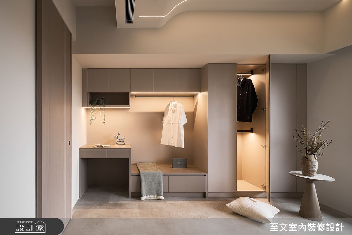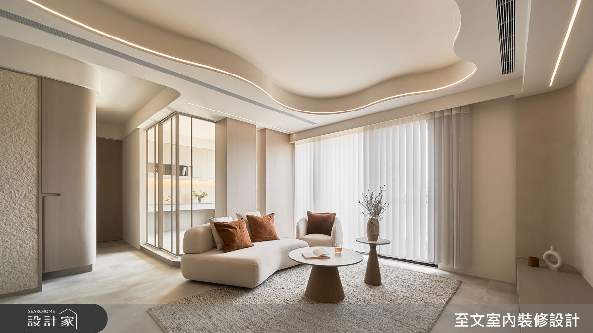 至文室內裝修設計以乳膠漆、木地板、灰鏡、茶玻、木作貼皮、系統板材、磁磚、人造石、噴漆的搭配應用,呈現侘寂風居家氛圍,將此間28坪、三房、單層、新成屋(5年以下)打造成舒適愜意的家庭空間,完成2位大人全家人的夢想之居。