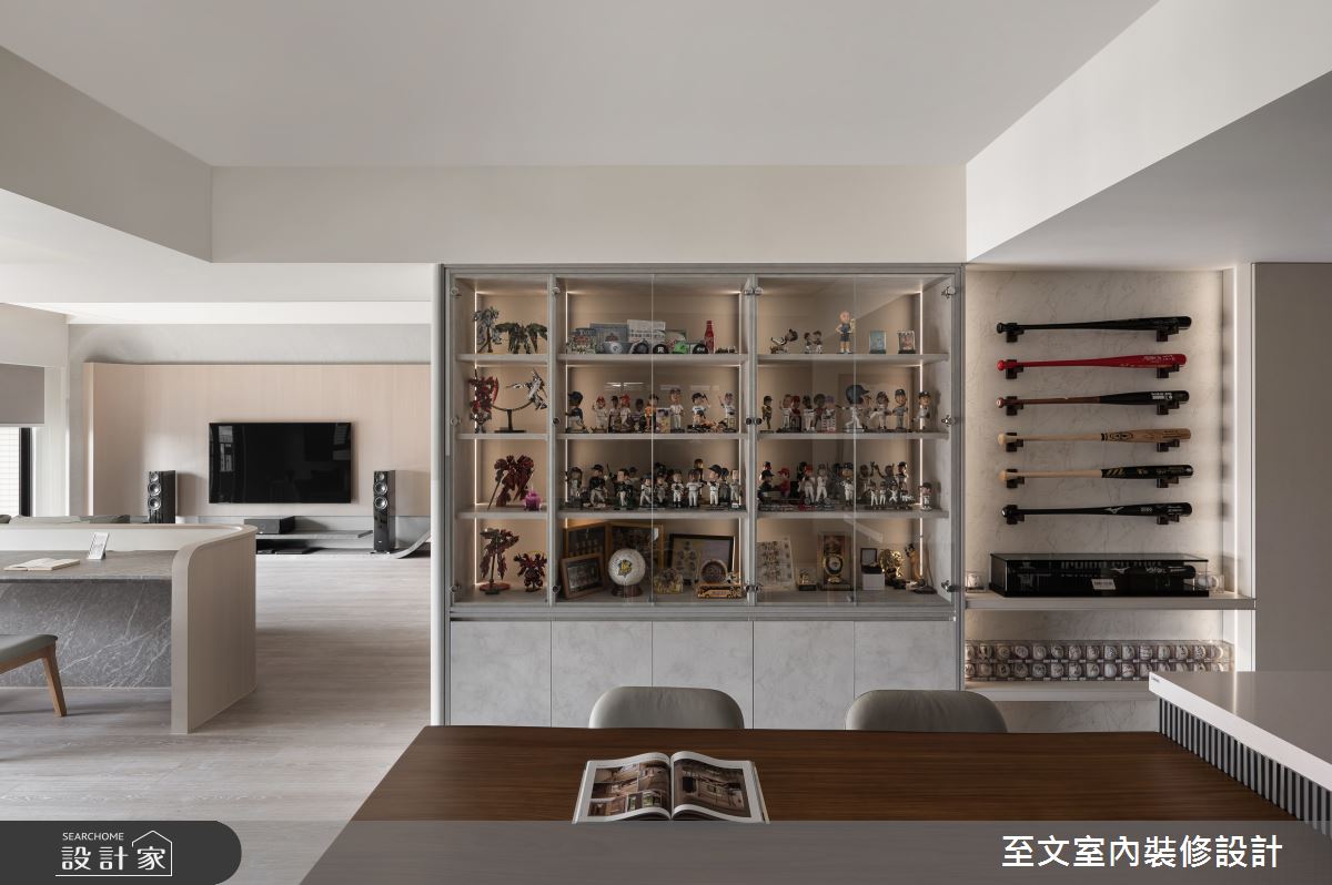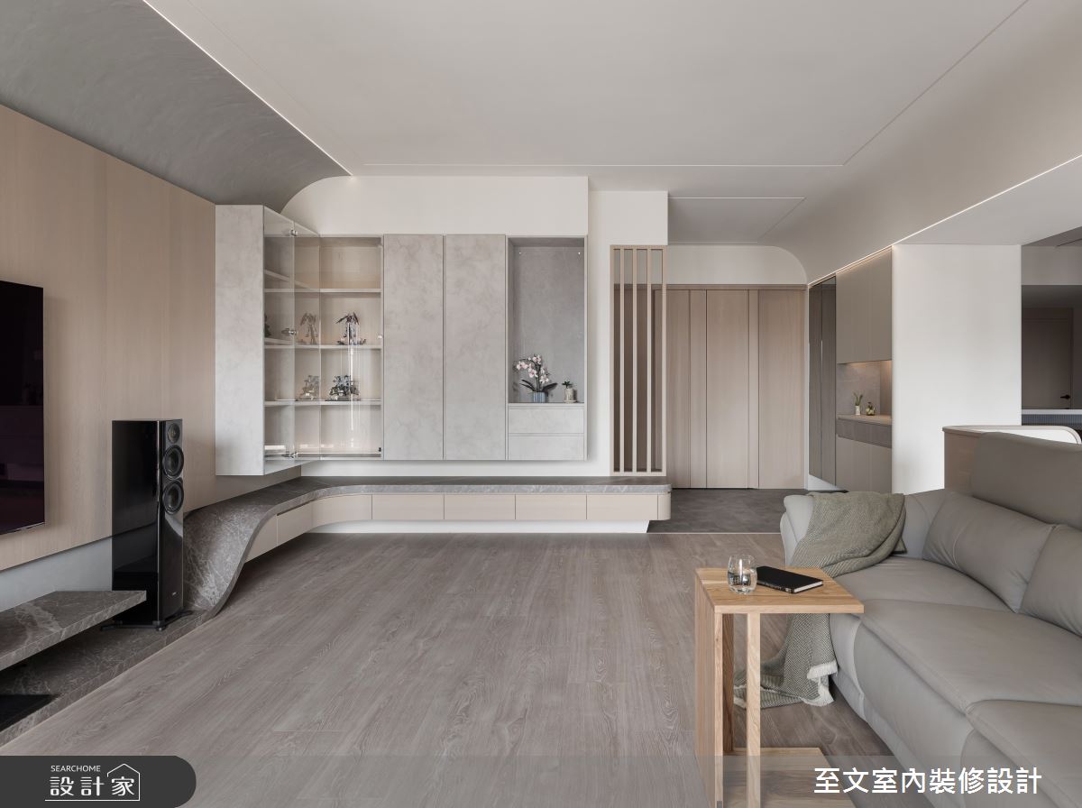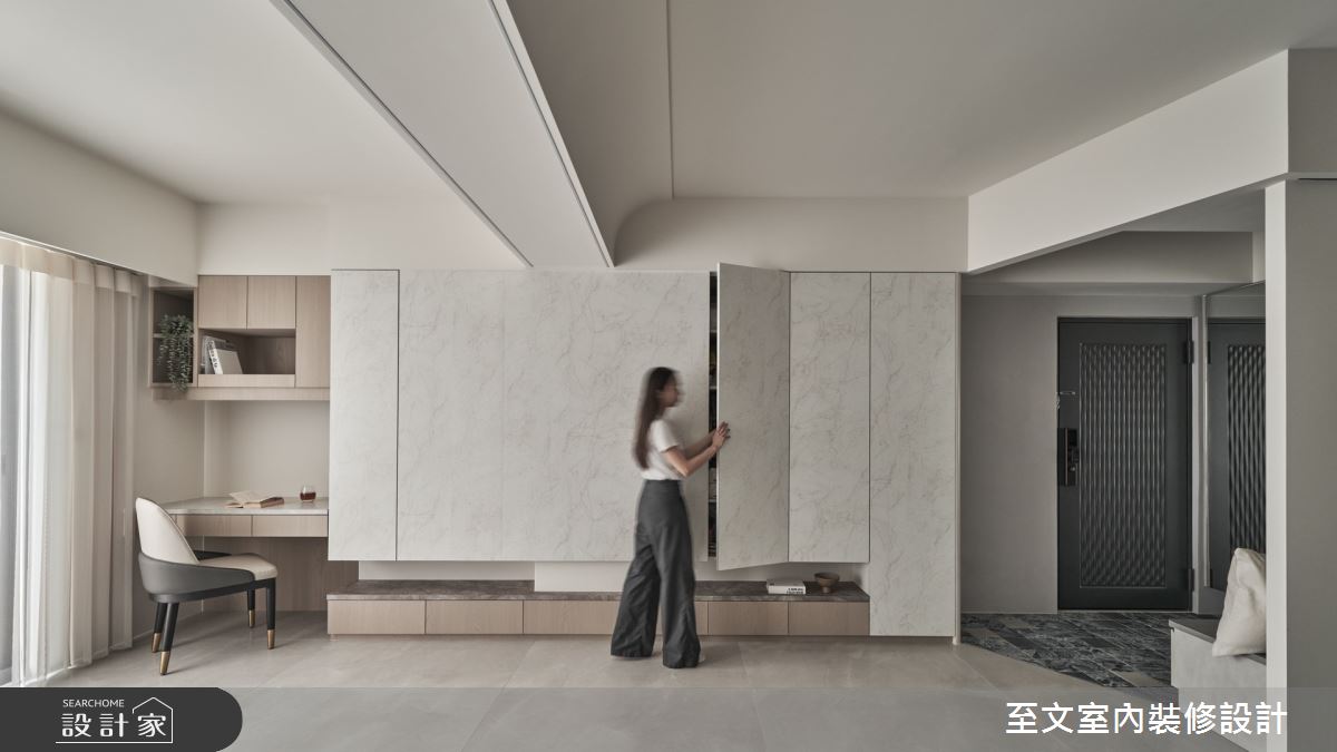 至文室內空間美學設計以造型地磚、超耐磨地板、木皮、鐵作門、大理石、系統櫃、乳膠漆的搭配應用,呈現現代風居家氛圍,將此間33坪、三房、單層、新成屋(5年以下)打造成舒適愜意的家庭空間,完成2位大人、2位小孩全家人的夢想之居。