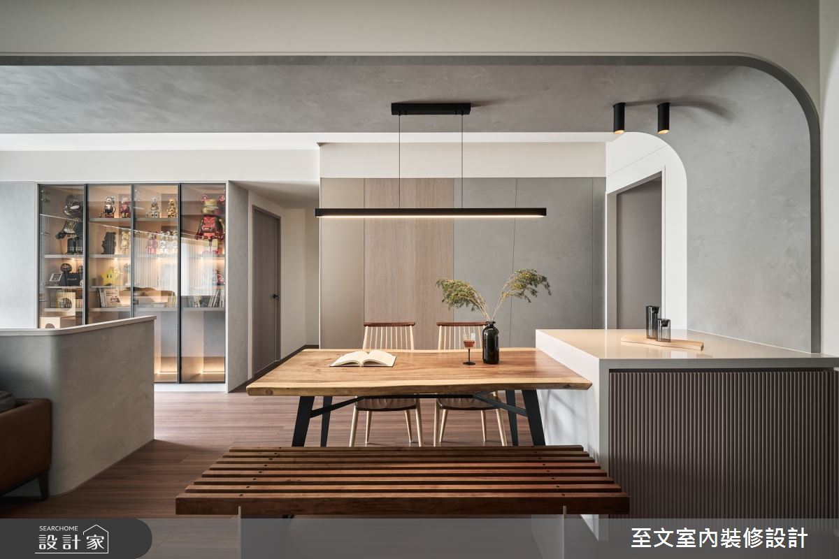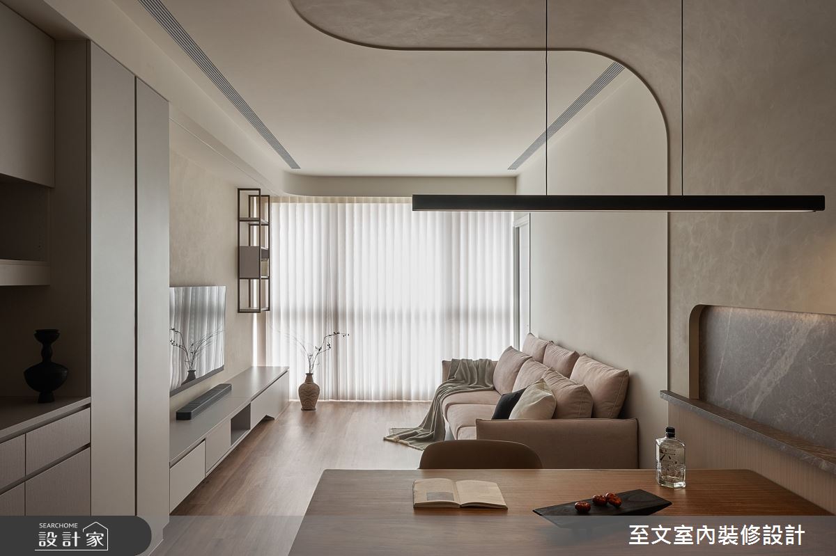 本案為至文室內裝修設計的38坪現代風中古屋(5~15年)設計作品,格局為單層三房的居住空間。居住成員包含2位大人。全室建材的搭配,應用乳膠漆、超耐磨木地板、鐵件、茶玻、系統板材、磁磚、木百葉、賽麗石、軌道燈、繃布、噴漆、明鏡、仿清水模漆、五金,展現溫馨的居家氛圍。