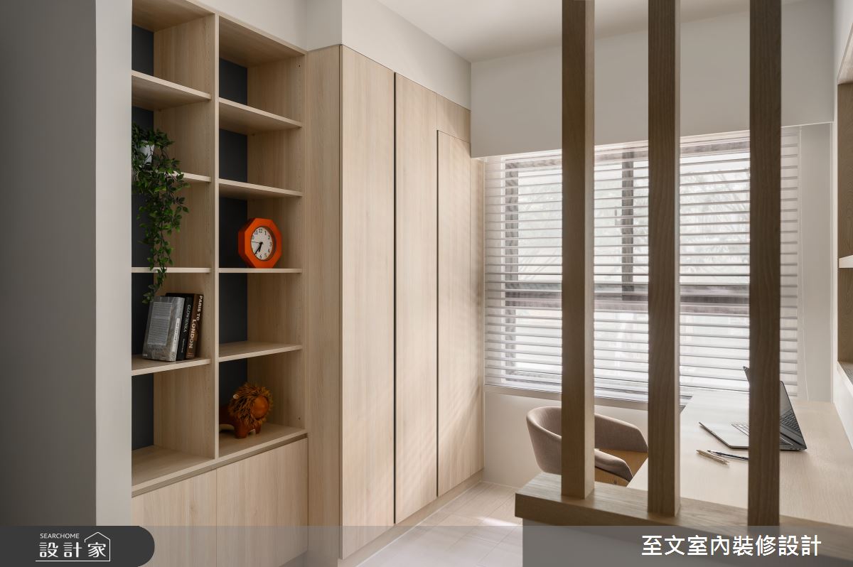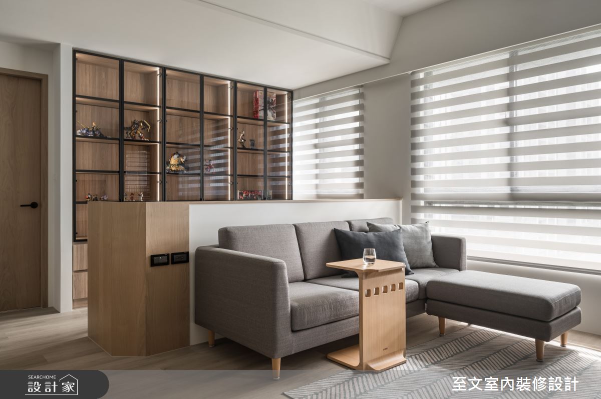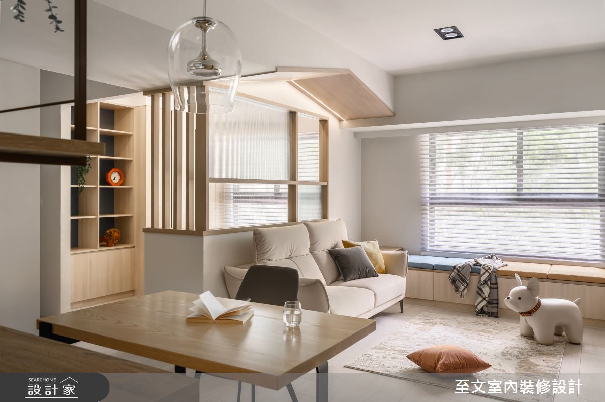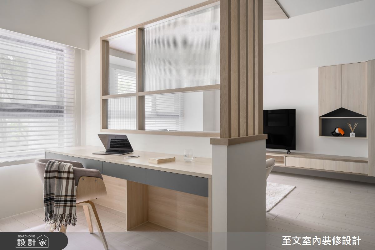 至文室內裝修設計以木皮、系統櫃、玻璃、鐵件、油漆、木地板的搭配應用,呈現日式風居家氛圍,將此間20坪、兩房、單層、新成屋(5年以下)打造成舒適愜意的家庭空間,完成2位大人全家人的夢想之居。
