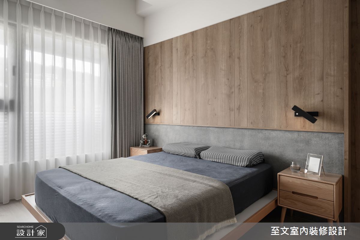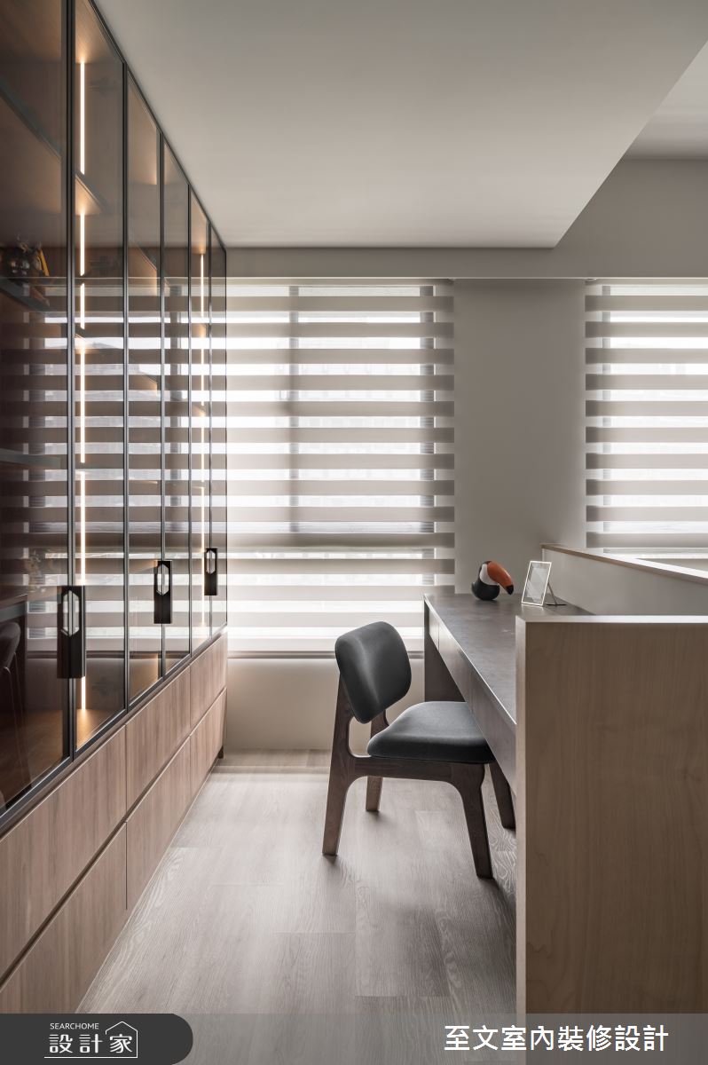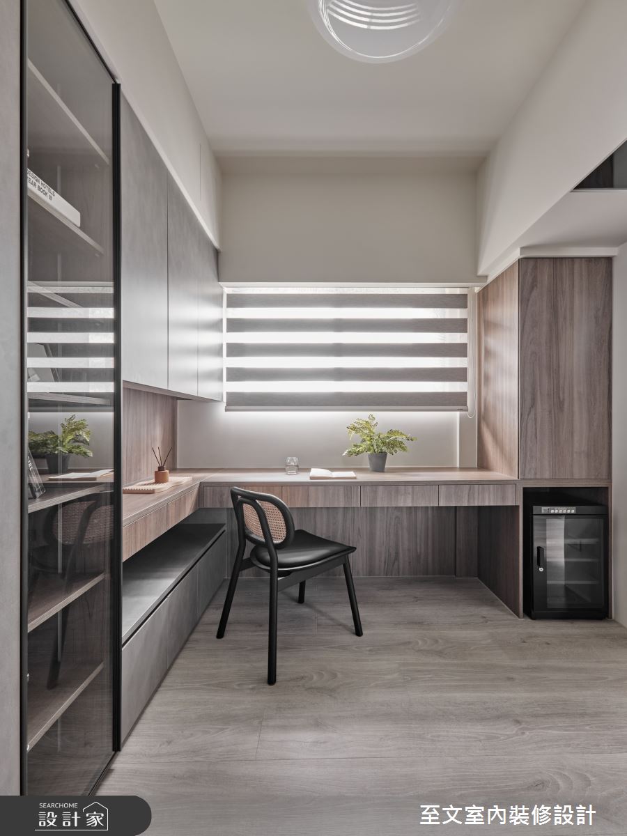 至文室內裝修設計以木皮、系統櫃、玻璃、鐵件、油漆、木地板的搭配應用,呈現日式風居家氛圍,將此間20坪、兩房、單層、新成屋(5年以下)打造成舒適愜意的家庭空間,完成2位大人全家人的夢想之居。