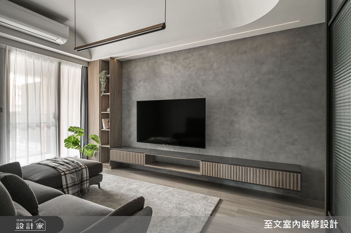 至文室內裝修設計以木地板、清水模、鐵件、玻璃、系統櫃、特殊漆的搭配應用,呈現現代風居家氛圍,將此間13坪、一房、單層、新成屋(5年以下)打造成舒適愜意的家庭空間,完成1位大人全家人的夢想之居。