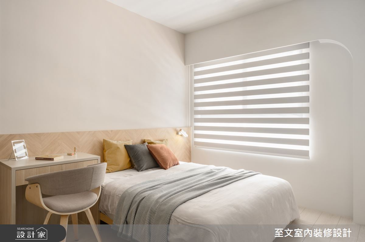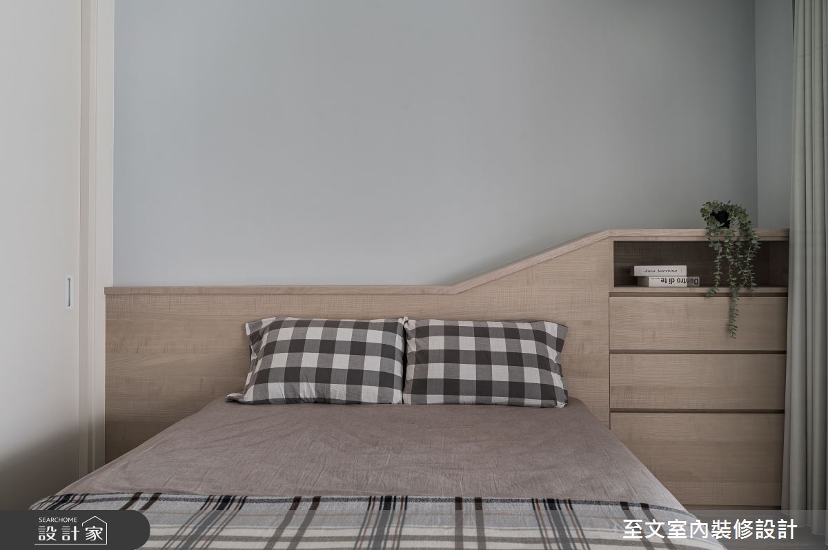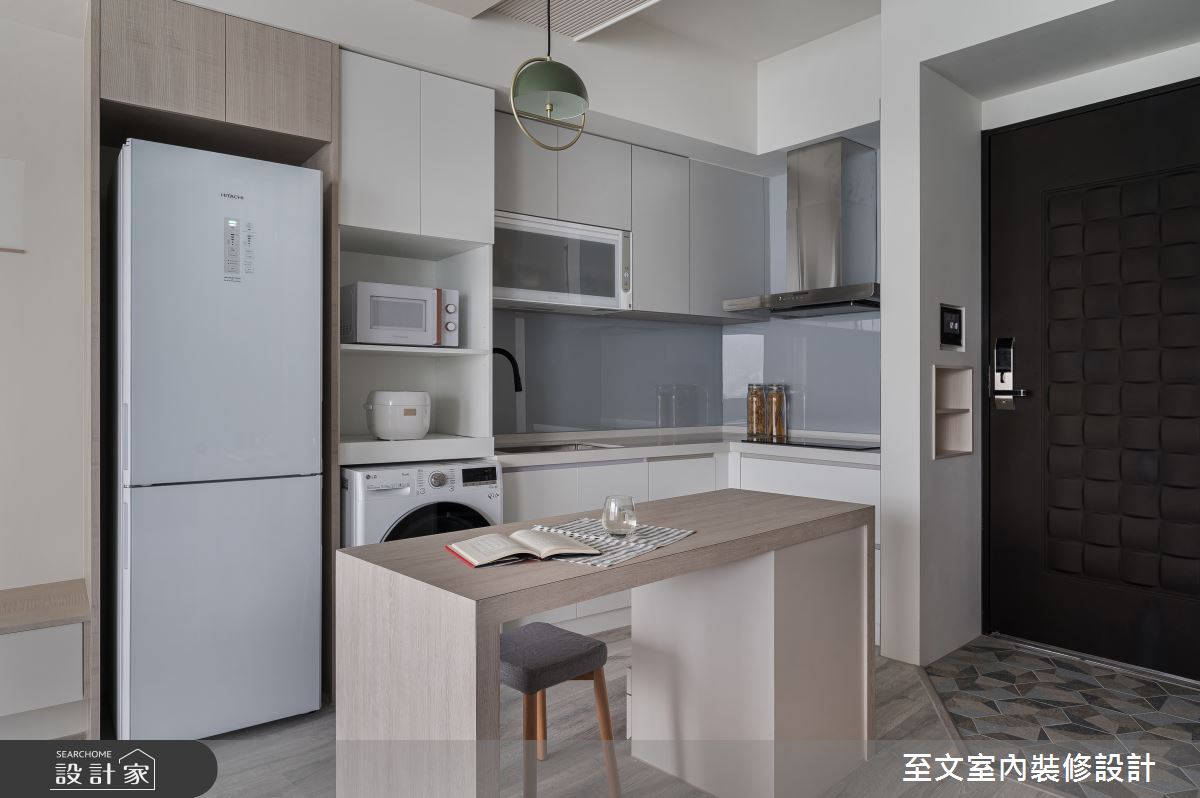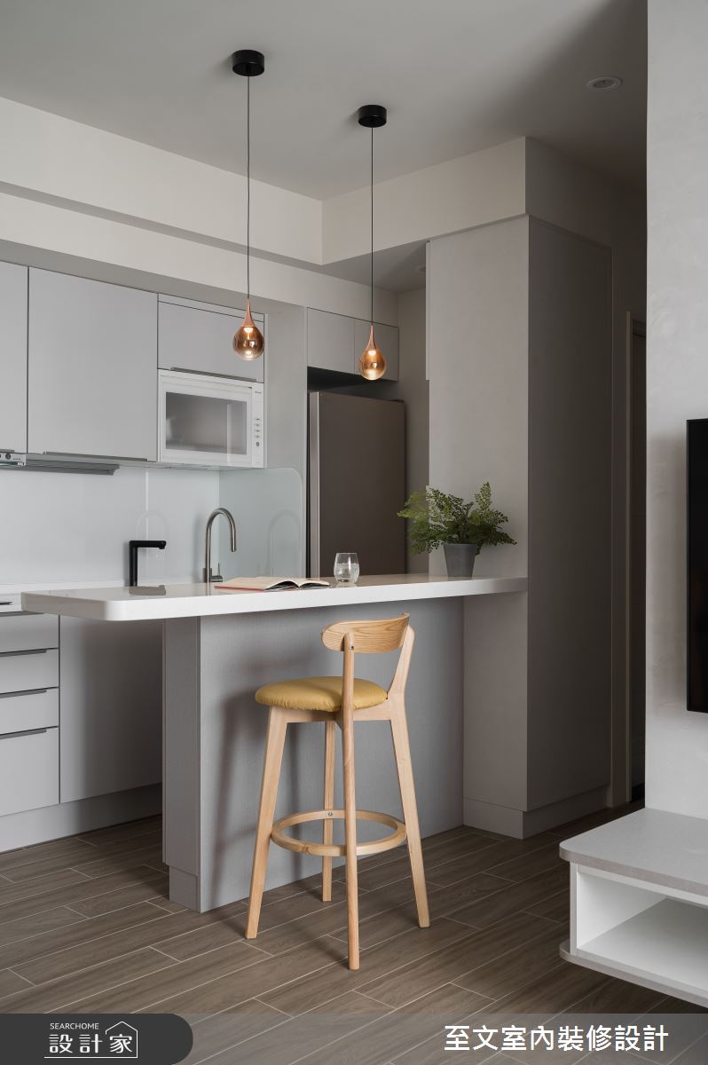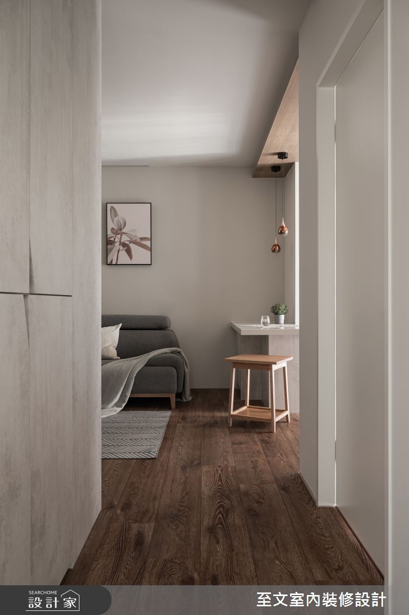 本案為至文室內裝修設計的13坪北歐風新成屋(5年以下)設計作品,格局為單層一房的居住空間。居住成員包含2位大人。全室建材的搭配,應用木作、噴漆、木皮、磁磚、超耐磨木地板,展現溫馨的居家氛圍。