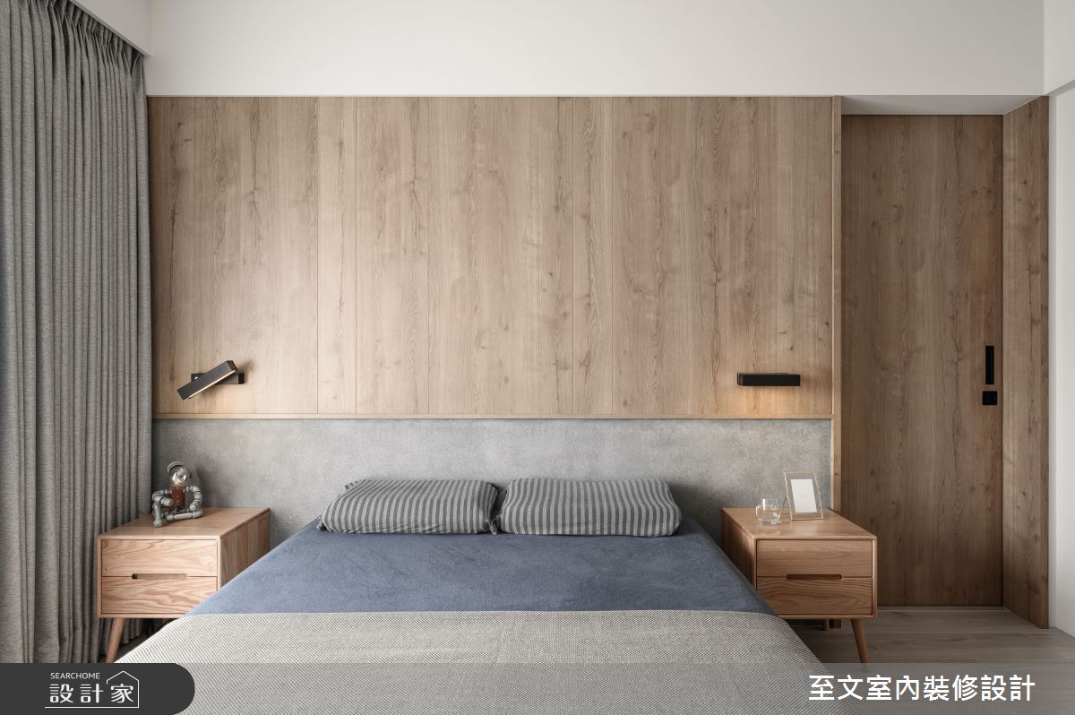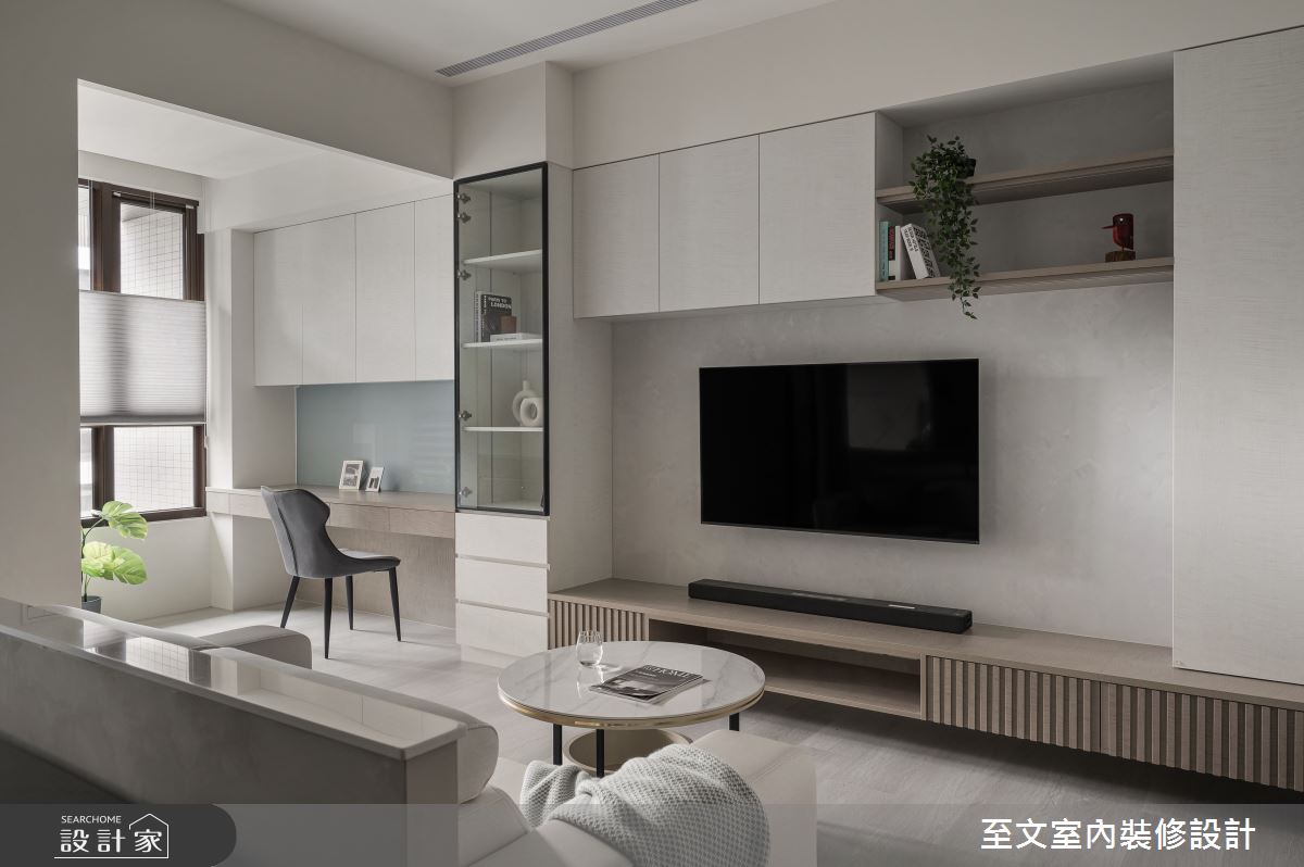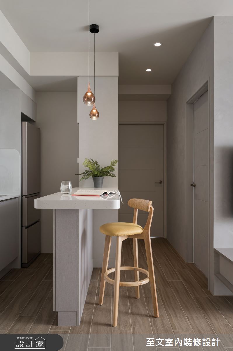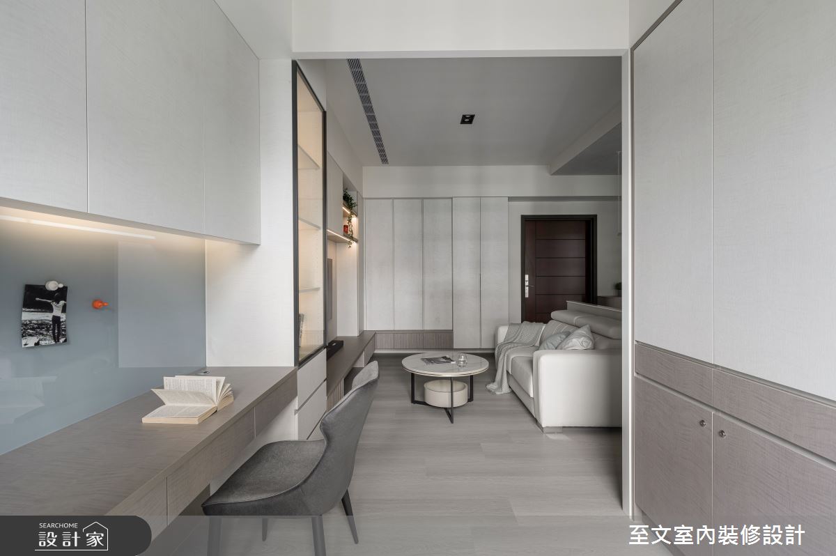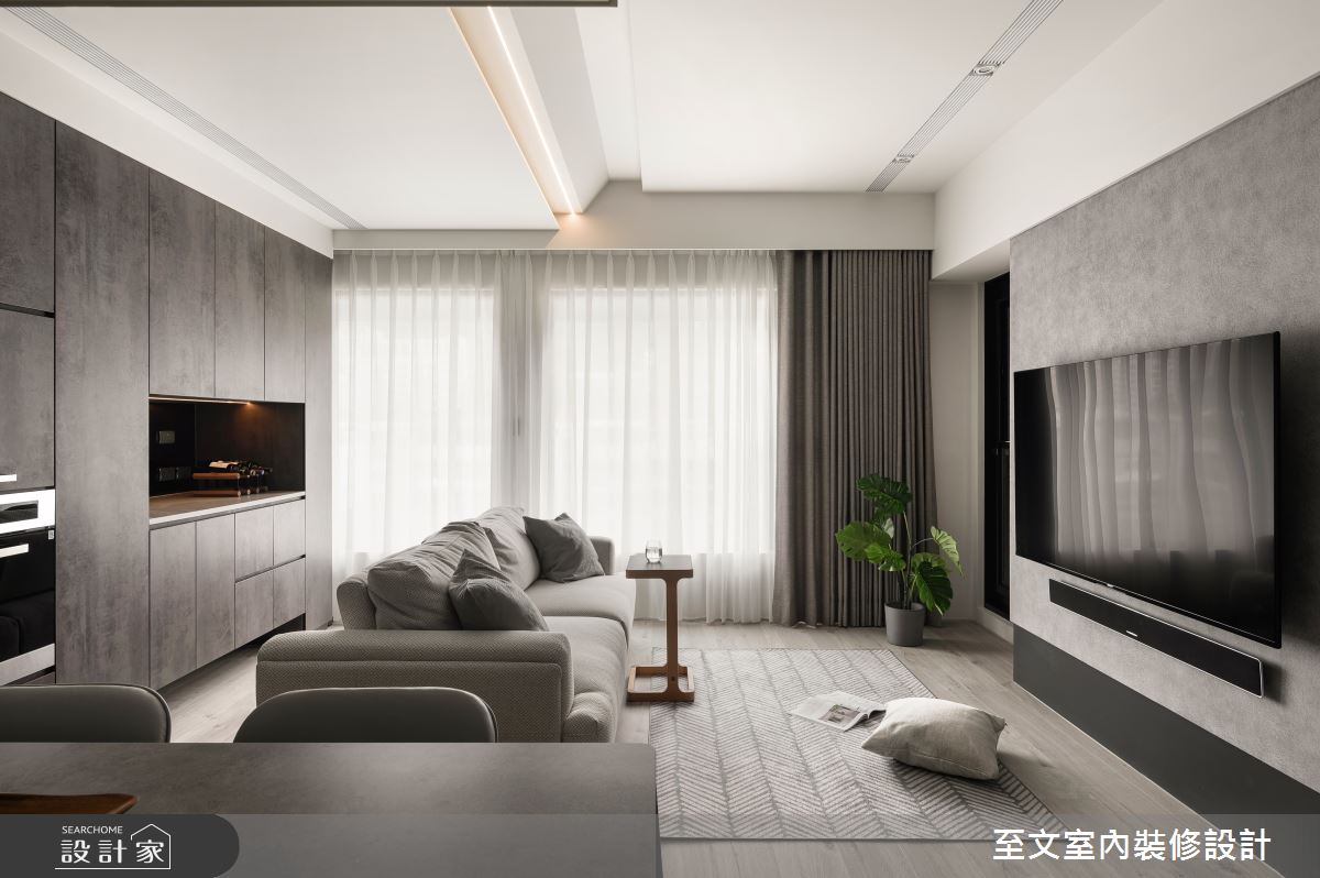 至文室內裝修設計以木作、天然木皮、系統櫃、木地板、鏡面、賽麗石、特殊塗料的搭配應用,呈現現代風居家氛圍,將此間18.7坪、兩房、單層、新成屋(5年以下)打造成舒適愜意的家庭空間,完成1位大人全家人的夢想之居。