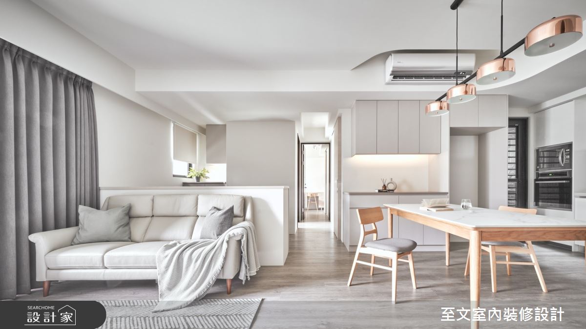 至文室內裝修設計以天然木皮、系統櫃、油漆、鐵件、人造石、特殊漆的搭配應用,呈現北歐風居家氛圍,將此間17.5坪、兩房、單層、新成屋(5年以下)打造成舒適愜意的家庭空間,完成全家人的夢想之居。