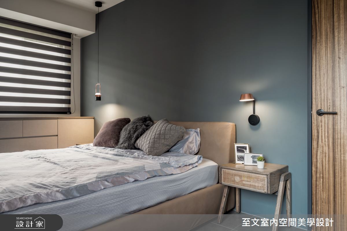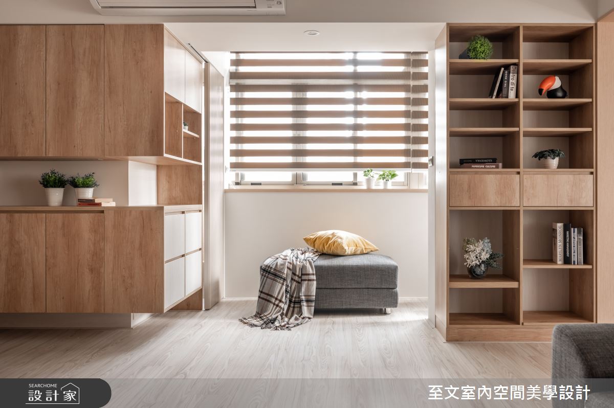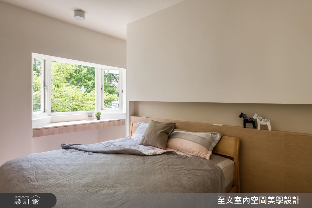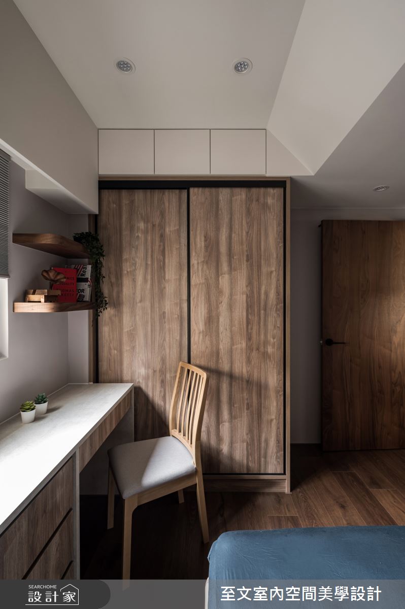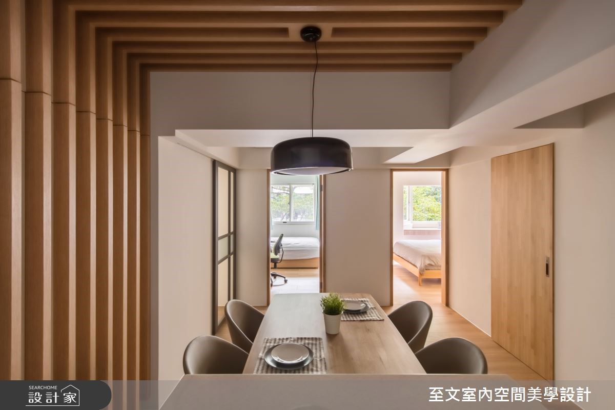33 坪北歐老宅原屋天花及大樑低矮,設計師巧用視覺設計化解格局難題,透過天花板異材質拼搭、櫃體設計比例的精準調配,拓寬空間尺度、兼顧美學設計,再適度的加入綠意植栽點綴,創造舒心恬靜的生活品質! 玄關一路延伸至電視主牆的櫃體,皆以懸空、上櫃高於下櫃的比例呈現,拉高了室內高度,空間寬敞舒服且具一致性。電視主牆的櫃體與層板分別使用三種建材混搭,一深一淺、一進一出交錯設計,造型大方有型為客廳增添不少層次感。緊鄰窗邊的天花板向窗面傾斜設計虛化了樑線,並擴增室內光照範圍。開放式餐廚自成一區,與客廳之間以玻璃鐵件拉門阻擋油煙氣味飄散,天、壁相互延伸的木格柵造型,則放大延展視覺。 小編的最愛 主臥格局稍作變更,將更衣空間安排主臥床頭後方,完整收攬市區住宅難得一件的綠意景致,兼具化妝台的書桌採面窗設計,讀書、梳妝皆能伴隨完美自然光。