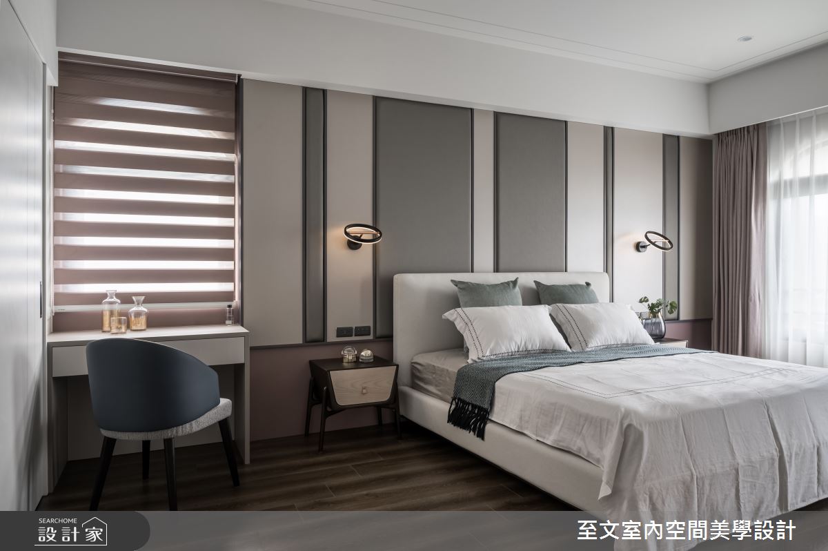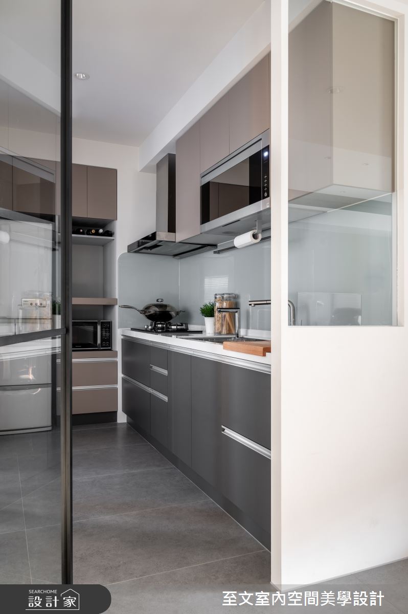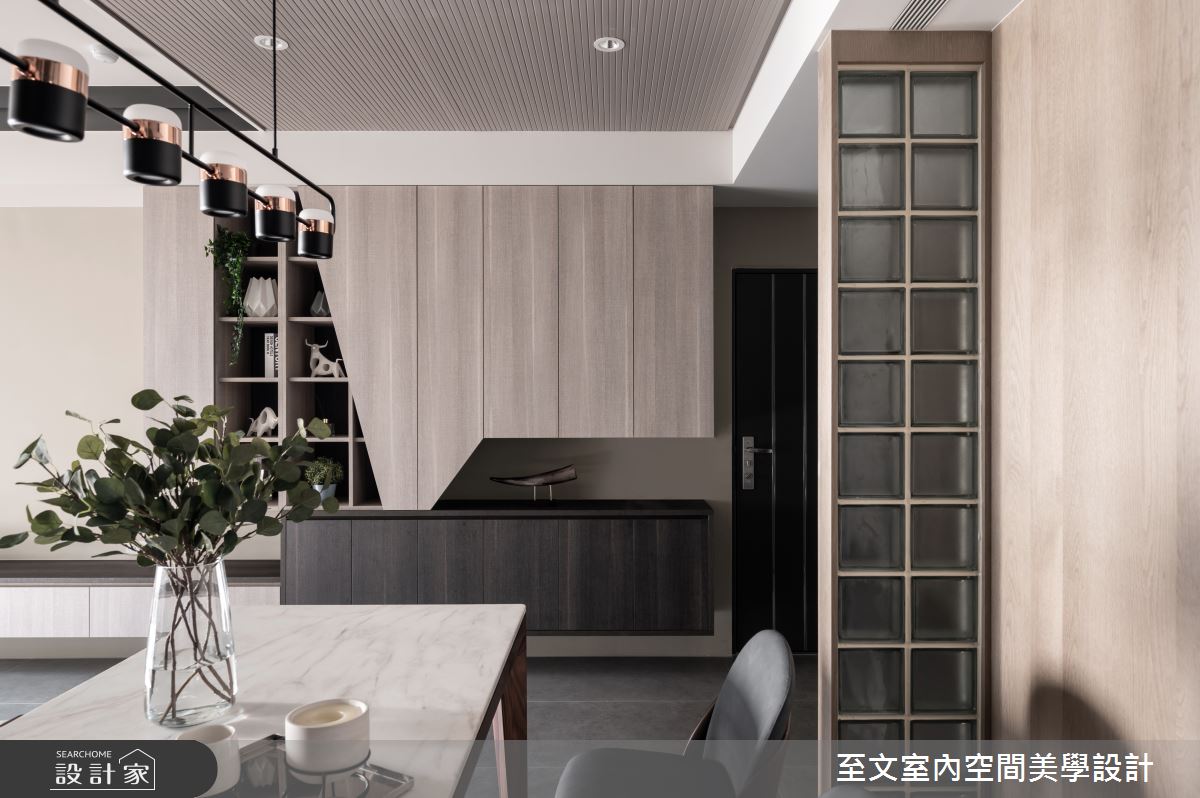 本案為至文室內空間美學設計的32坪現代風中古屋(5~15年)設計作品,格局為單層三房的居住空間。居住成員包含2位大人、2位小孩。全室建材的搭配,應用霧面石英磚、木皮、系統櫃、乳膠漆、玻璃磚、鐵件玻璃門,展現溫馨的居家氛圍。