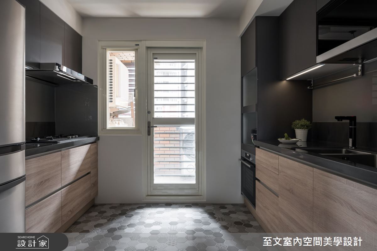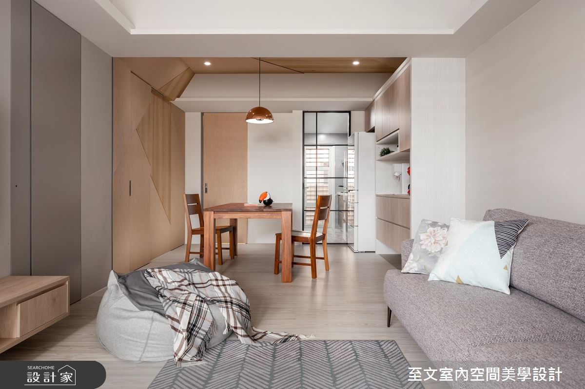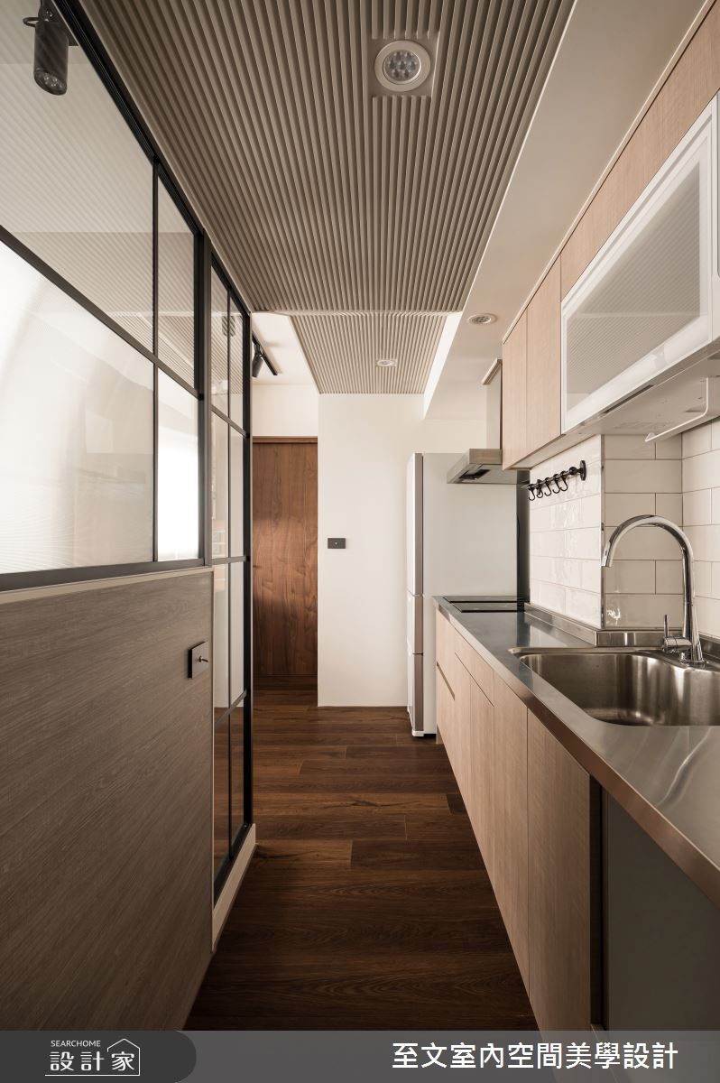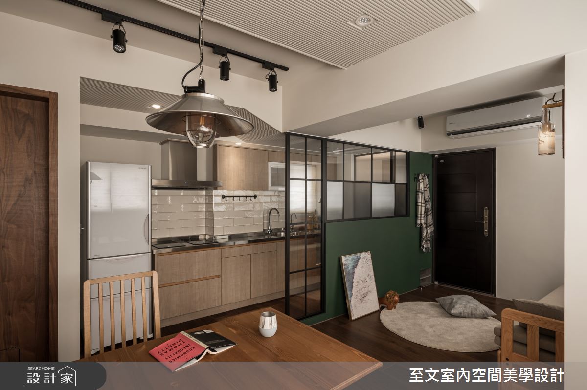 由至文室內空間美學設計精心規劃的11坪一房住宅空間,家庭成員一共有1位大人。因應屋主需求,設計師運用混搭風作為主軸,搭配超耐磨地板、鐵件玻璃、不鏽鋼廚具檯面、系統櫃、乳膠漆、造型牆磚,打造全家人的夢想家居。