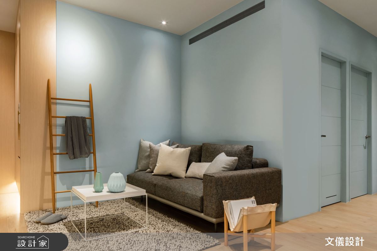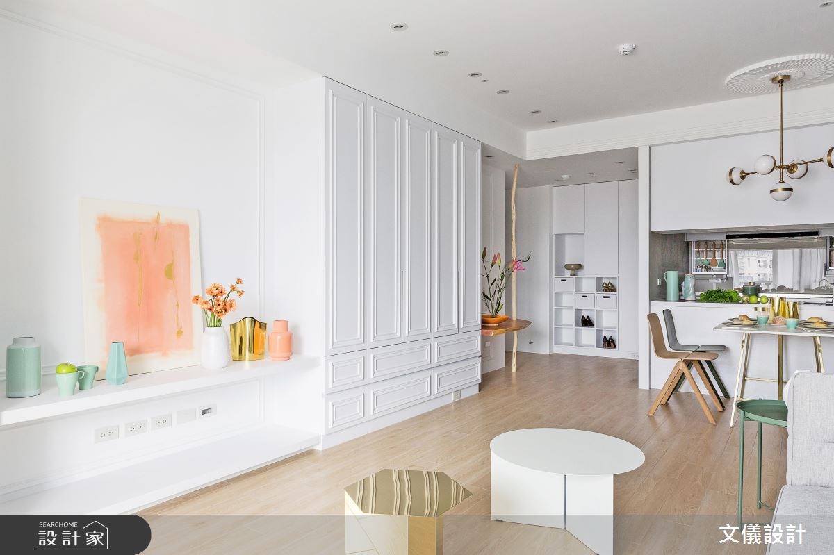 身為日式花藝老師的屋主,鍾情法式空間的浪漫想像,因此結合19世紀日本主義與歐洲藝術的文化內涵,轉化為室內的法式線板與日式俐落的線條、圖騰,讓法日精湛的美感相融。 從玄關開始,淺色木紋的地坪鋪敘一室,白色系的收納櫃結合開放與封閉收納,打破制式的規矩,轉角以自然枝幹貫穿原木平台,上方擺設花藝之作,形塑和風藝術端景之美。自然光隨著網紗窗簾篩灑一地,讓空間裡的繽紛色系更加鮮明、耀眼,公領域裡更讓藍與白色調成為唯一的風格表述,整片沙發背牆漆上水藍色調,一旁配置四排收納機能,其櫃體間自然流露的溝縫,刻劃出視覺層次;壁面另一側的亮橘色畫作,彷彿太陽般綻放溫暖熱度,加上花卉綠意的點綴,彷彿置身在鳥語花香的大自然裡;電視牆以白色為基調,無大費周章的裝修,僅以線板簡單描繪原生壁面,平台上隨著風格器皿或是物件擺設,挹注人文氣質;以中島簡單界定出餐廚領域,餐桌椅則藉由簡約的線條描繪,乾淨、俐落的線條之中更展現輕盈視感,體驗愜意無壓的居家風格。 小編的最愛 主臥室裡以裸色系為主,展現春天般的時尚質感;女兒房裡則佐入綠色調,且結合睡眠與工作區,讓生活美感與機能兼備。