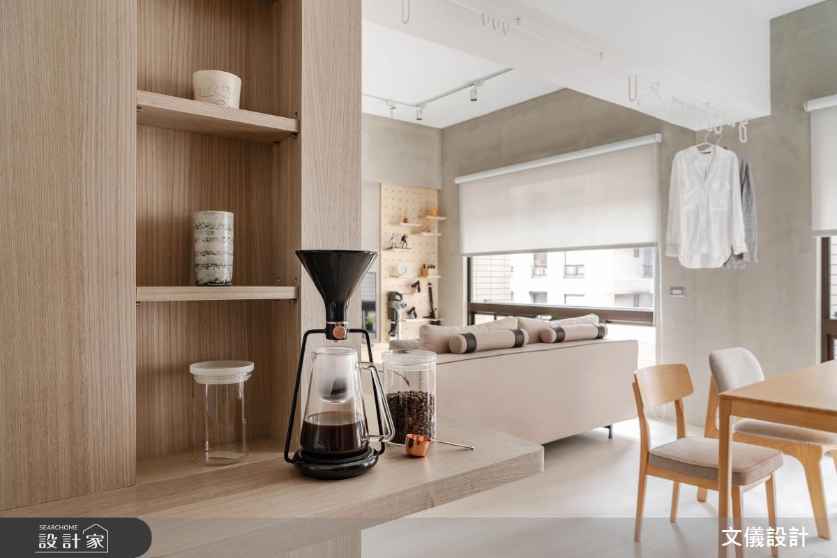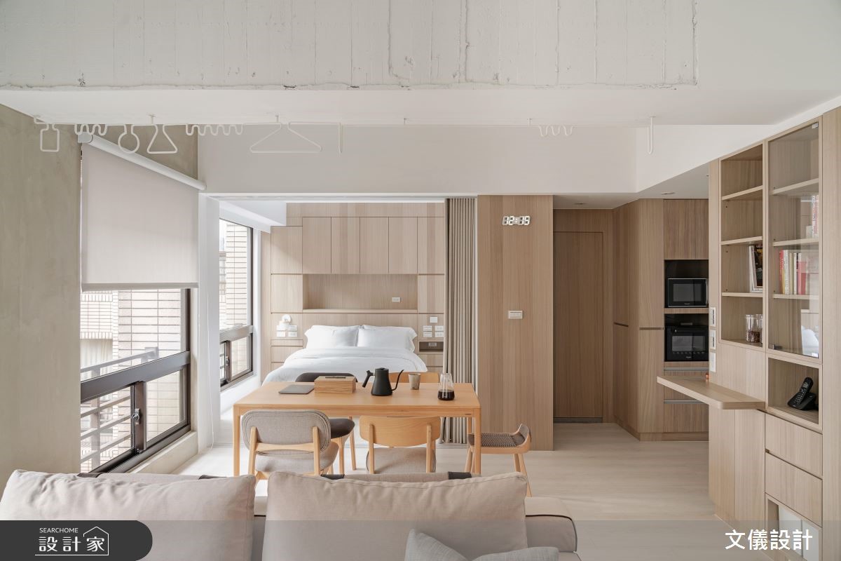 設計師打破 17 坪現代宅的兩房兩廳格局,將光線帶進一個人的退休生活,並在日式極簡感居家裡,加入有點叛逆的工業元素,釋放屋主內心的活潑小男孩。 踏入玄關,水泥粉光地坪上鏤刻著屋主喜愛的詩文,讓每一次坐在穿鞋椅的時刻,都能夠反覆咀嚼文學的精華。公領域採用開放式的設計,且利用溫暖的木紋、質樸的樂土妝點立面,在日光的襯托下,呈現輕盈柔和的空間氛圍。而斑駁的大樑則劃分客餐廳的界線,並於樑下設置俏皮曬衣架,使屋主能隨心所欲地掛衣物。 在收納方面,電視牆運用洞洞板搭配層板,歸納屋主的家電和收藏品,成為室內的有趣端景。餐廚之間則藉由轉角處的收納櫃,結合煮咖啡的吧檯,讓人能夠整齊放置器具與書籍,享受充滿咖啡香氣的午後時光。而臥房在床頭和側邊,規劃整面櫃體,使空間機能最大化,睡起來舒適無負擔。 小編的最愛 捨棄不必要的隔間牆,臥房以玻璃拉門界定格局範圍,保持了光線的穿透,塑造空間的敞亮,而當需要休息時,又可以把拉簾關上,維持休息時的隱密。