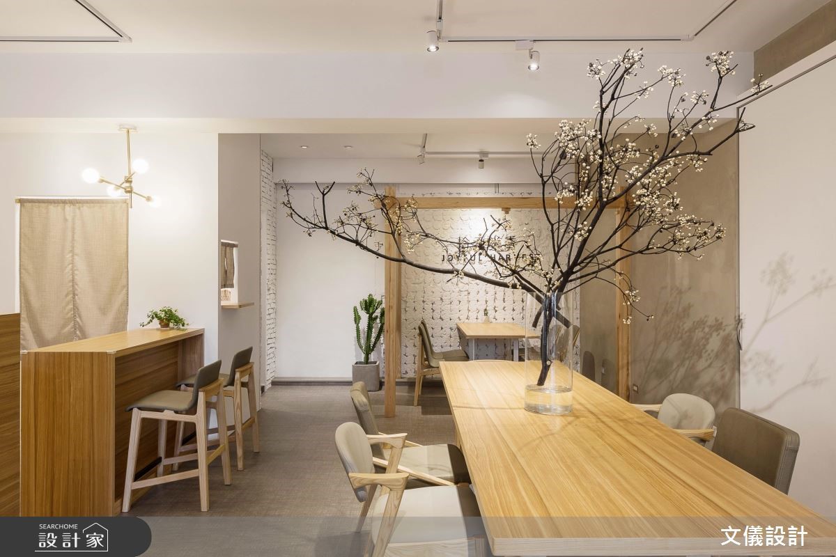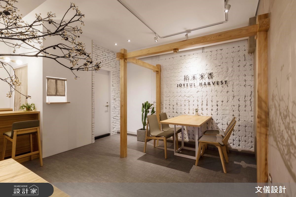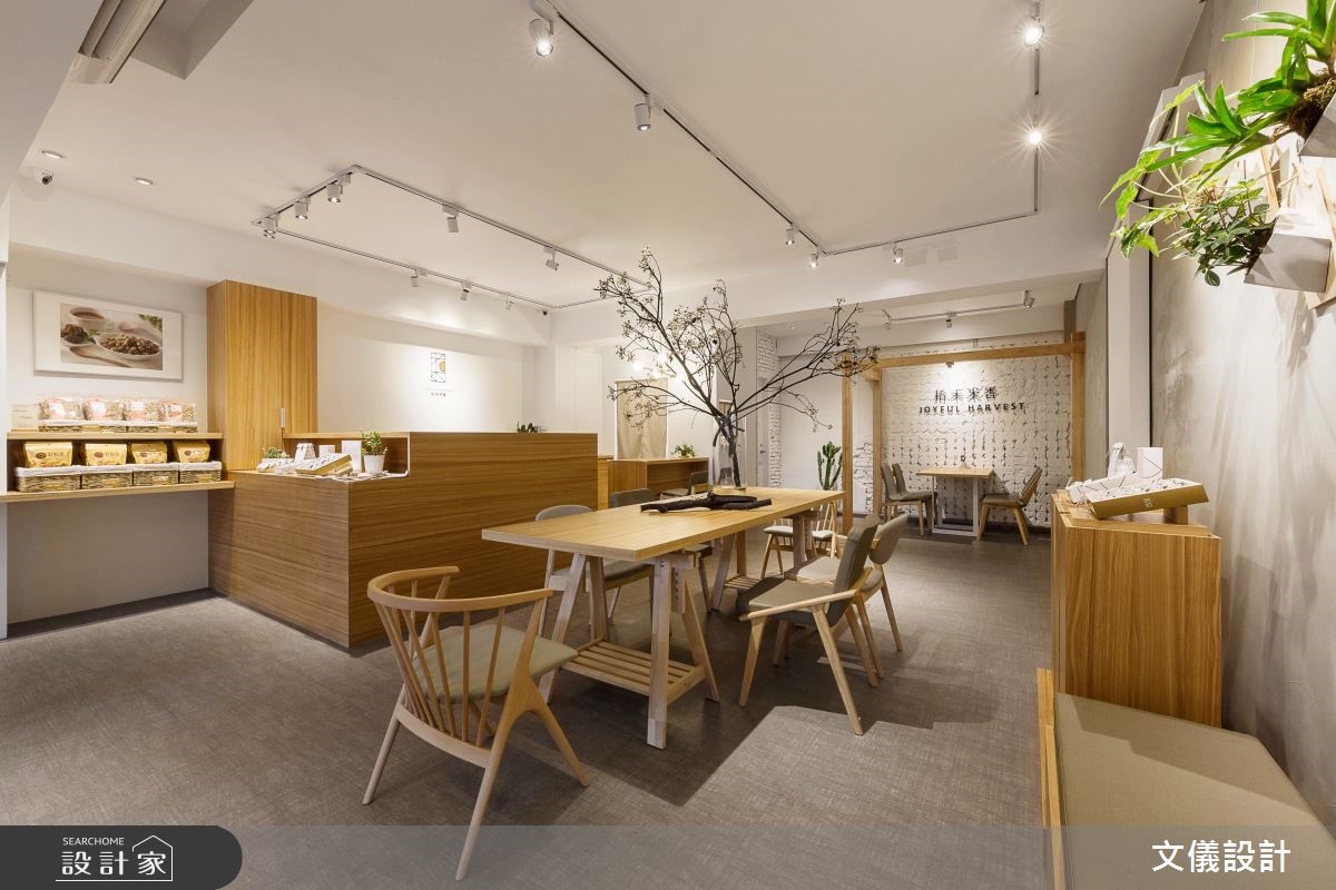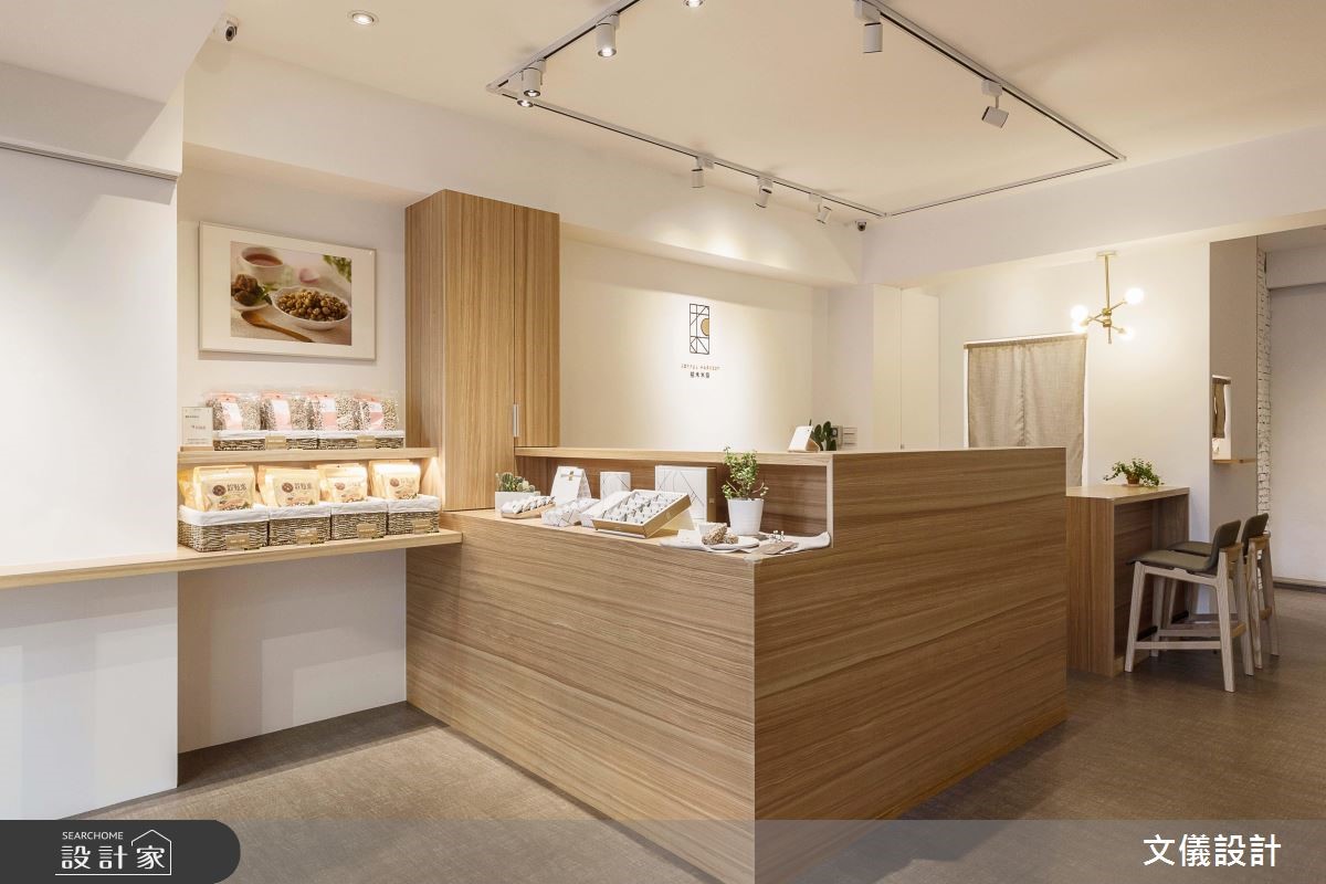 此案為中古屋翻新,現在已是一家知名的「爆米香」老店。設計師透過簡約的空間基底,溫潤的木皮鋪陳出暖調氣息,同時安排植物妝點室內,讓走進空間裡的人們感受最自然、愜意的氛圍。 開放的空間裡,軌道燈遊走在簡約、無刻意裝修的天花板,白色與大地色系的調和下,形塑溫馨的自然風尚。右側壁面鋪上樂土,幾個綠意植栽妝點其中,長桌上更擺設一株薏仁樹,呼應「爆米香」的品牌精神,枝葉線條勾勒出漸層美感,醞釀天然的空氣感氛圍;角落空間特別以實木卡榫搭建一個場域,拆除磁磚的壁面留下粗獷痕跡,且噴上白色油漆,渲染出樸實的自然美感,牆面上則掛上品牌的LOGO字樣,將簾幕放下後,就成了客人與會的接待空間。大量留白的場域裡,俐落線條感的牆面與櫃體為室內一大特色,拿掉繁複設計可達到易於清潔的效果。 小編的最愛 空間裡安排展示商品的陳列機能,中央還有桌椅的陳設,讓客人挑選商品的同時,也能坐下來聊天、互動,並欣賞室內營造出來的美學設計。