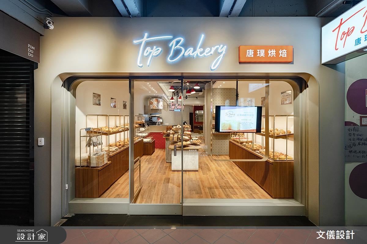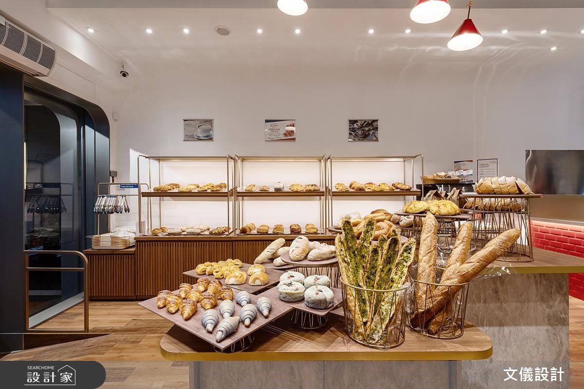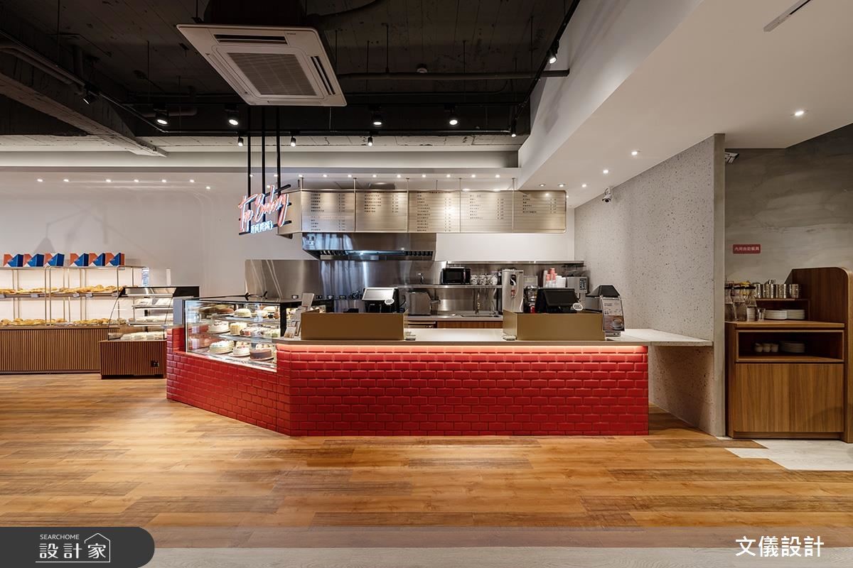 熱騰騰的麵包出爐囉!47 坪現代風烘培坊,迎賓櫃台及高腳椅區,以紅色意象大膽詮釋定調空間主色,不自覺挑起了顧客食慾,優雅大方的白色牆面,則象徵各式麵包的精緻口感,塑造享用麵包也能時尚又精緻空間概念! 入口販售區純淨優雅的白牆,讓各式麵包大方陳列,搭配帶有弧度的木作、金屬層架,以視覺感染味蕾,增添麵包精緻口感。收銀區紅色鐵道磚牆,搭配紅色高腳椅,帶出活潑熱情意象,順勢引導入座動線。沿著高腳椅走進內部座位區,改以深色系木頭賦予些許沉穩,立面的金屬手繪牆與金屬勾邊單椅,點亮木質地坪、灰質樂土牆面,創造時尚用餐氣氛。 小編的最愛 牆面貓咪手繪設計,為施工時柱子裡被救出的小貓咪發想而來,可愛的手繪技巧及金屬巧妙搭配,賦予空間獨特質感,增添另類的溫暖與故事。