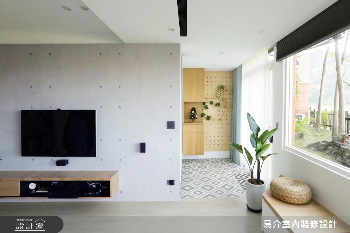 易介室內裝修設計以乳膠漆、花磚、壁紙、超耐磨木地板、鐵件、烤玻、木作貼皮、烤漆、軌道燈、珪藻土的搭配應用,呈現北歐風居家氛圍,將此間35坪、四房、單層、新成屋(5年以下)打造成舒適愜意的家庭空間,完成2位大人、2位小孩全家人的夢想之居。