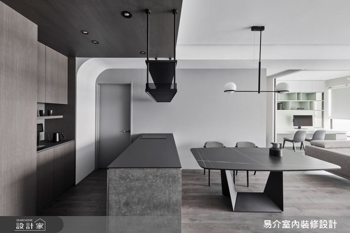 易介室內裝修設計以水泥漆、超耐磨木地板、鐵件、灰鏡、烤漆、壓克力、噴漆的搭配應用,呈現現代風居家氛圍,將此間40坪、三房、單層、新成屋(5年以下)打造成舒適愜意的家庭空間,完成2位大人全家人的夢想之居。