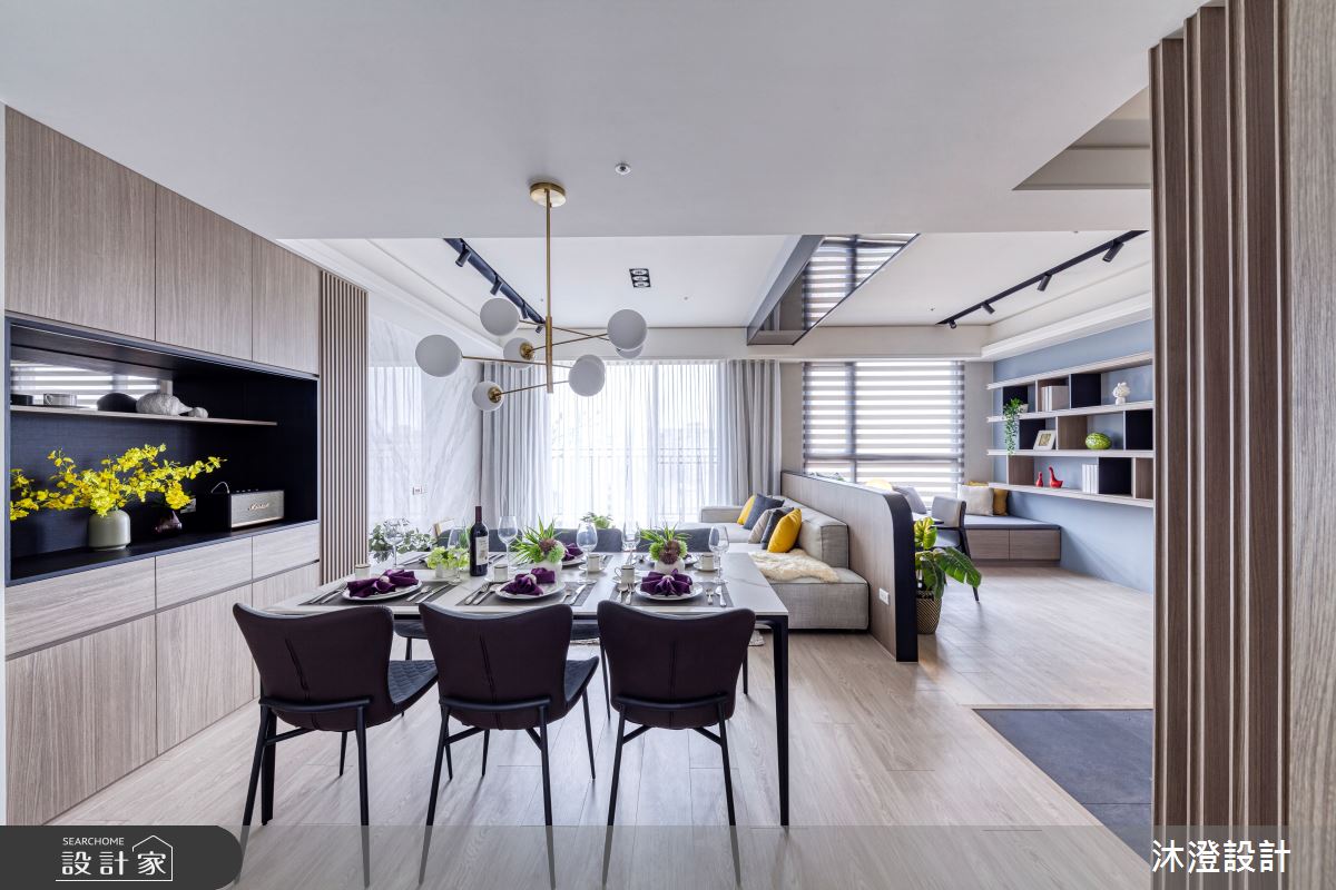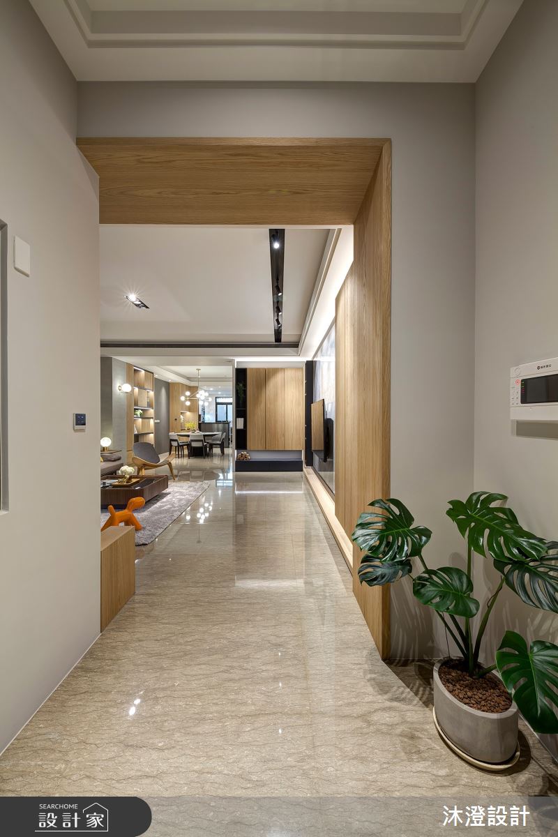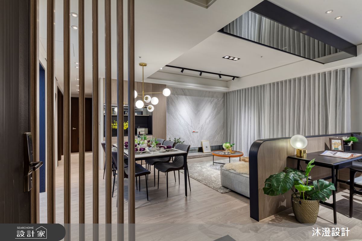 由沐澄設計精心規劃的60坪四房住宅空間,家庭成員一共有2位大人、2位小孩。因應屋主需求,設計師運用現代風作為主軸,搭配大理石/銀狐、灰色玻璃、木皮、灰鏡、ICI塗料、系統櫥櫃、超耐磨木地板,打造全家人的夢想家居。