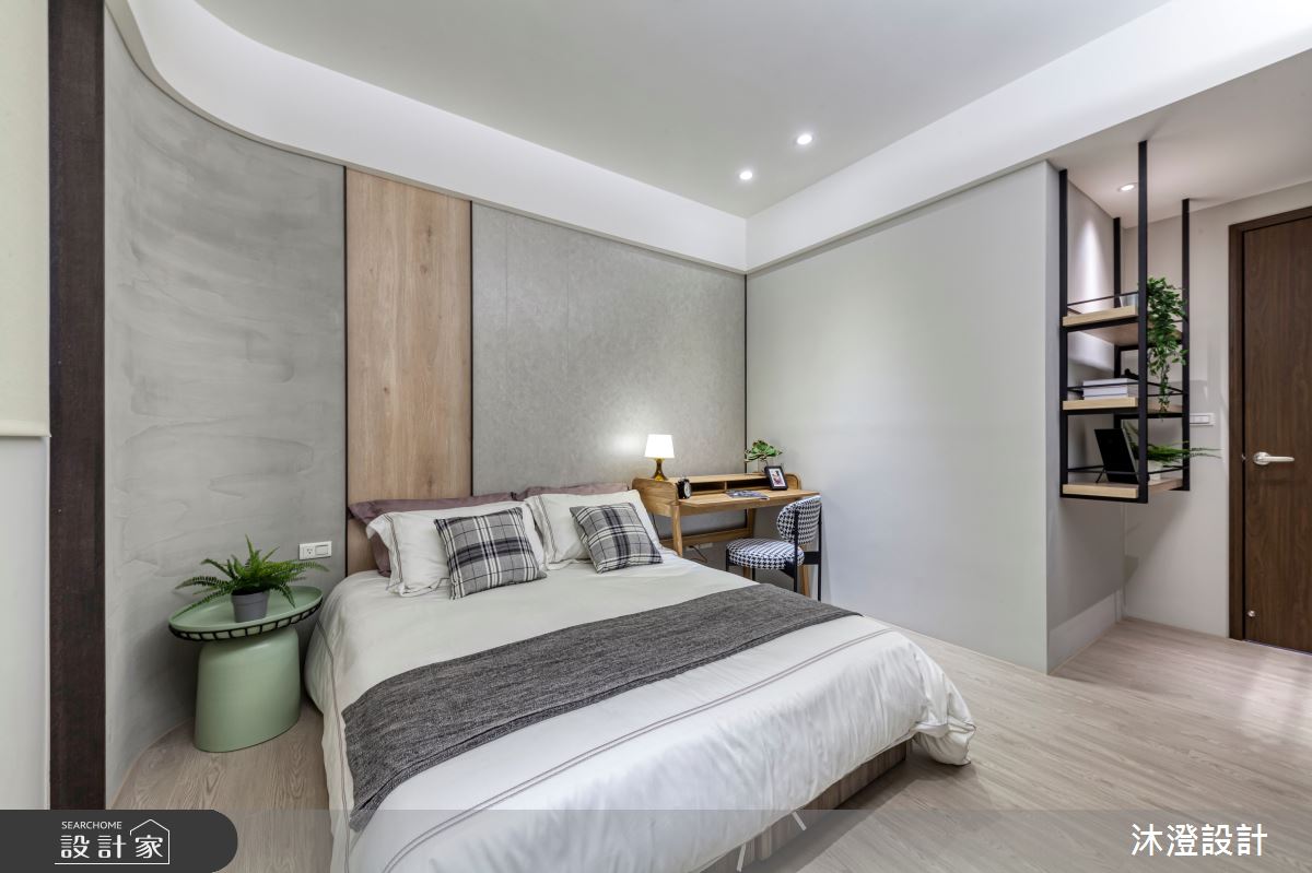 沐澄設計以深灰花崗石、灰色系文化石、人造石、仿清水模板、鋁門洞洞板、灰色烤漆玻璃、灰鏡、特殊漆樂土、ICI乳膠漆、超耐磨木地板、歐規系統櫥櫃的搭配應用,呈現現代風居家氛圍,將此間60坪、四房、單層、中古屋(5~15年)打造成舒適愜意的家庭空間,完成2位大人全家人的夢想之居。