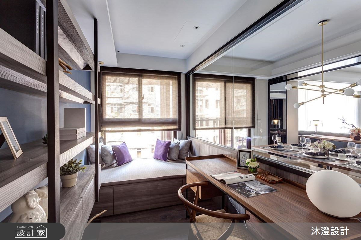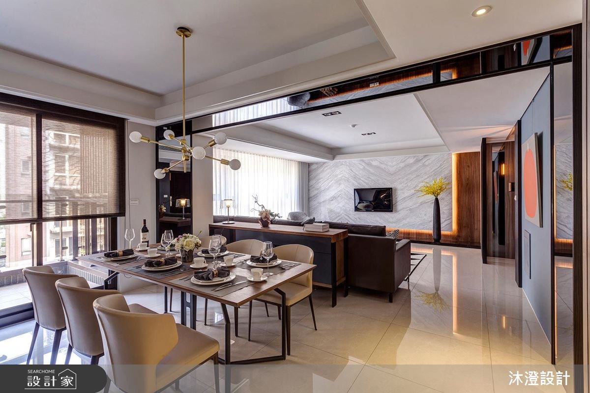 82 坪的現代風大宅,運用大量的自然拼木皮鋪設出牆面的溫暖感受,加上石材紋理的自然氣息,讓整體空間在灰鏡的襯托之下,呈現雙人宅邸的不凡氣韻。 開放式的公領域藉由一道灰鏡修飾的大樑,以及仿古銀灰珍珠大理石矮牆,分割出兩大區塊:一邊是客廳,一邊則是餐廳和書房。餐廳區域將收納櫃整合成一面牆,並利用樂土塗料妝點牆面,搭配展示鐵件與櫃體下方的鏡面,讓空間帶點輕工業的粗獷元素。 推開沙發背牆的門扉,隱藏於其後的主臥,選擇灰色的床頭牆及收納櫃,讓整體調性更加沉穩,且於床頭設置梳妝檯,完整了空間機能。次臥在自然光的照射下,展現灰白的極簡風格。起居室採取圓點深色壁紙,與客廳的氛圍做出區隔,讓夫妻有一個安靜的休閒空間。 小編的最愛 廚房利用長虹玻璃門,將立面收整乾淨,又能夠有效防止油煙影響生活品質。