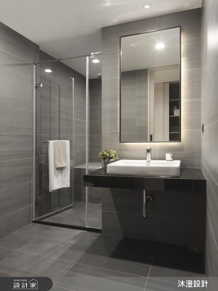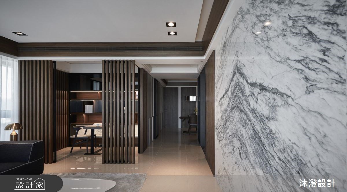 1 家 4 口的新成屋,透過設計師細膩精準的美學設計,將大理石、灰玻、不鏽鋼及鏡面精巧搭配,締造屬於 63 坪大邸的沉穩高雅韻味。 玄關處將格局缺陷轉化為設計一部分,無法更動的樑柱成為了畫框,暗色系廊道挹注幾盞燈光,展現藝術長廊般靜謐氣氛。走進室內公領域,由暗轉亮視覺放大拉開空間尺度,客廳區雪白石紋大理石電視牆,與大型L型沙發組合,增添豪邸氣度,展現輕盈低調的奢華感。格柵、透明拉門設計的書房,引光入室同時給予使用者一份專注場域。廊道櫃體運用大理石襯托收納品,層架則搭佐不鏽鋼材質,別出心裁的設計,為屋主收藏珍品的最佳展示舞台。 小編的最愛 臥房以馬鞍皮、鍍鈦飾條營造時尚奢華意象,主臥電視牆輕巧劃分臥室格局,完整私密空間機能使用,同時作為隱私屏蔽,且延續主色彩-灰調鋪陳,一氣呵成的雋永氣息將公、私領域完美串連。