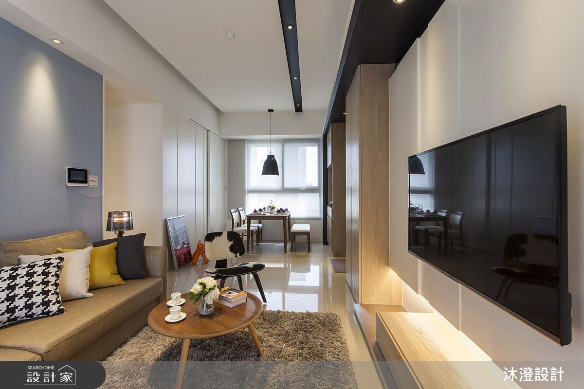 本案為 39 坪現代宅,設計師採以鮮明線性貫穿公共區域,讓空間結構與比例顯得純粹簡約,並加入實用的機能規劃,打造出功能、美感兼具的單身住宅,快跟著小編一起來看看吧! 設計師以入口大門為中介點,區隔出餐廳及客廳區塊,並在天花作出黑色ㄇ字型框架,串聯餐櫃鞋櫃與電視主牆,沙發牆融入了整面藍紫跳色,以輕盈色調匯聚焦點,彰顯簡約不單調的年輕現代氛圍;餐區,則呈現開放規畫,以窗戶引進自然採光,讓公領域的前後光線得以連結,塑造明亮場景,且在一側白牆加入線性線條,作出進出面的立體修飾,巧妙地弱化門片的存在感,型塑輕簡俐落的畫面;主臥內,在床頭給予特殊色噴漆,除了表現居者的個性,也與公領域的沙發牆達成色彩呼應,電視牆則與衣櫃、書桌一體成型,在有限的場域內,營造美型俐落的機能表情! 小編的最愛 次臥房,採用淺綠色做為主調,並配置整排鐵件木層板懸吊書櫃,緩解櫃體壓迫性,創造輕質的量體風貌!