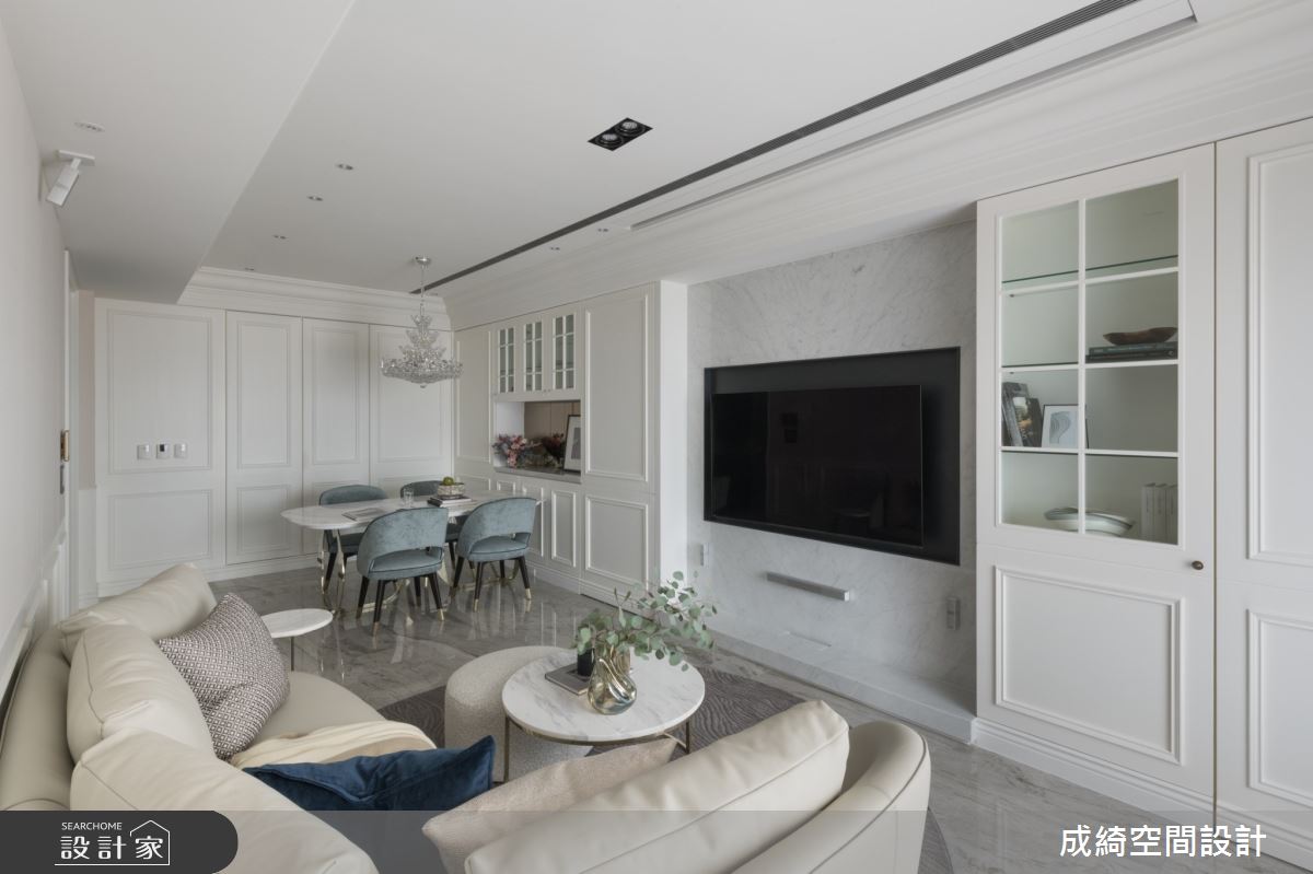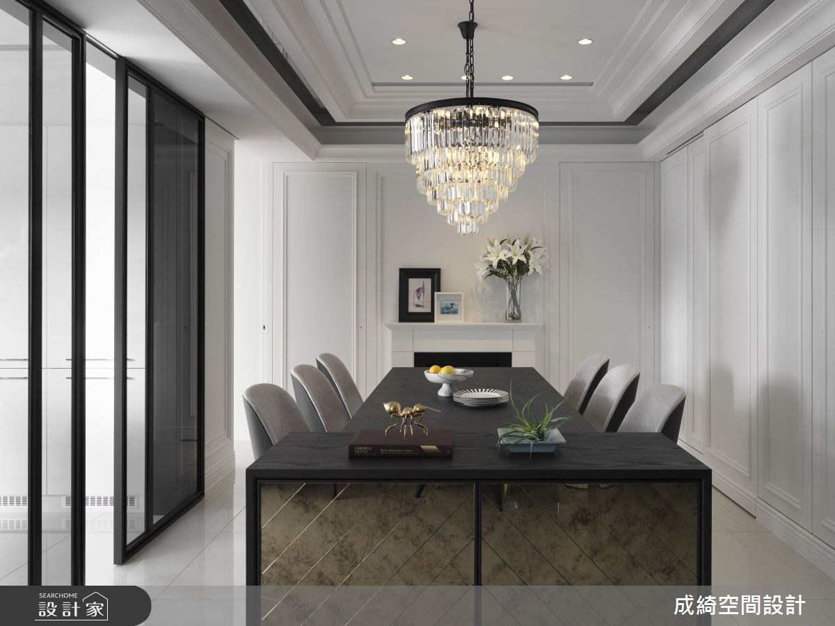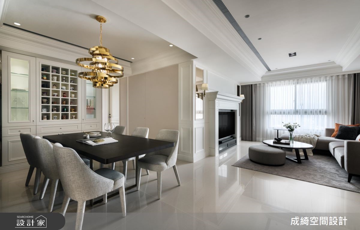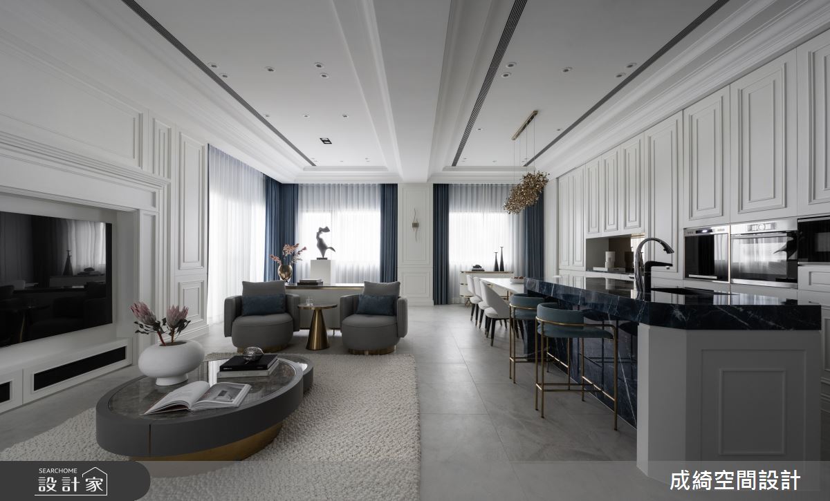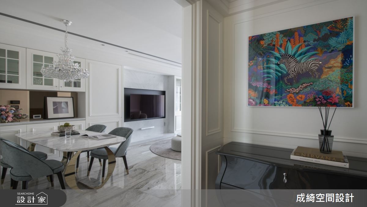 來自成綺空間設計的60坪新古典住宅案,屋主一家人共有2位大人、2位小孩,是一間單層新成屋(5年以下)的四房格局,設計師藉由建材以線板、鏡子、鐵件、烤漆、石材、木地板、地磚、壁紙的搭配應用,實現一家人的理想生活。