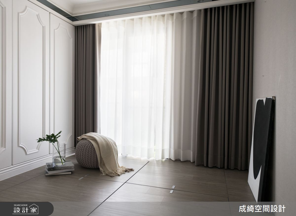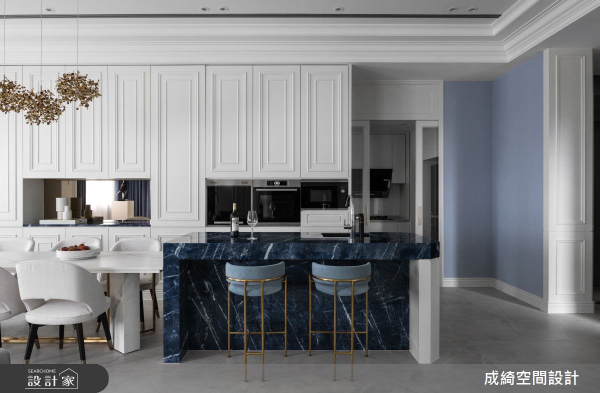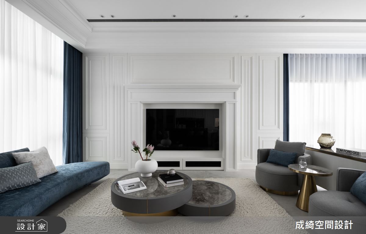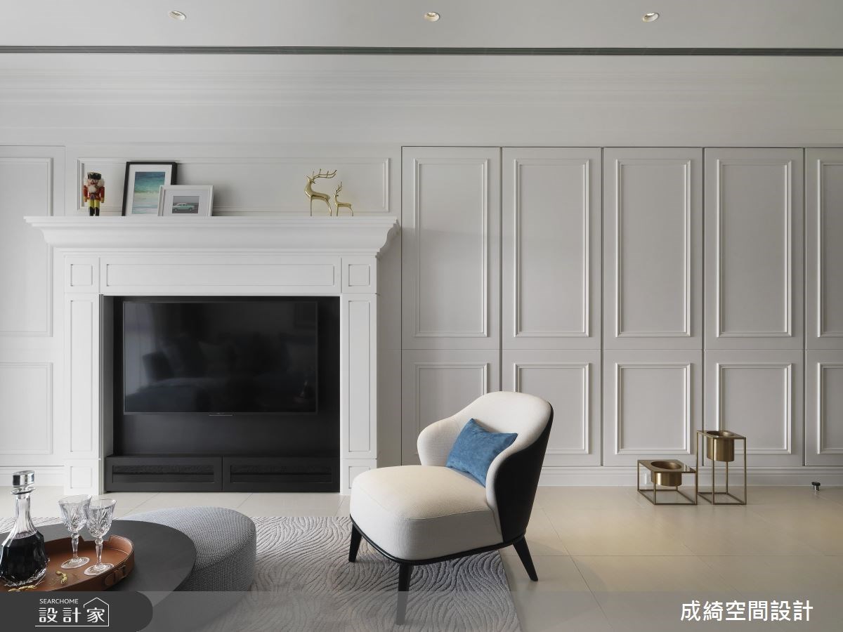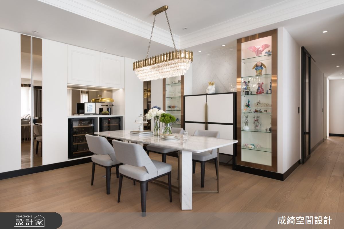 來自成綺空間設計的60坪新古典住宅案,屋主一家人共有2位大人、2位小孩,是一間單層新成屋(5年以下)的四房格局,設計師藉由建材以線板、鏡子、鐵件、烤漆、石材、木地板、地磚、壁紙的搭配應用,實現一家人的理想生活。