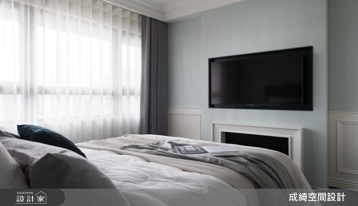 42 坪美式風住宅擁有明亮的採光條件,因此設計師善於屋況優勢,在室內以純白線板、淺色壁紙鋪敘,營造寬敞柔美的居家氣息,並巧妙經營隱藏式設計,勾勒出一家三口的高機能生活。 一進門,右側利用線板語彙修飾玄關櫃,且延伸元素至電視牆,創造一致的視覺效果。客餐廳採取開放式規劃,從百葉窗透進的自然光,映照於藍色壁紙與古典線板妝點的立面,散發輕盈優雅的空間氣質。客廳藉由壁爐造型裝飾電視牆,搭配舒適的灰色沙發,軟化公領域的線條與框架。 餐廳以金屬光澤吊燈,界定用餐環境的高雅質感,兩側的玻璃展示櫃與鏡面收納櫃相互輝映,拓展空間的開闊度。主臥延續公領域牆面的線板修飾,床頭旁配置通往衛浴的隱藏門,保持視覺的簡潔感,又能化解風水疑慮。床尾則運用拉門隱藏更衣室,為女主人劃分出專屬的梳妝區域,滿足多元的休憩功能。 小編的最愛 考量到長輩偶爾會來拜訪,設計師在淺綠色書房設置下掀式摺疊床,平時能夠收闔起來變成完整牆面,有需求時又能隨時放下供暫時住宿,保有滿滿的機動性。