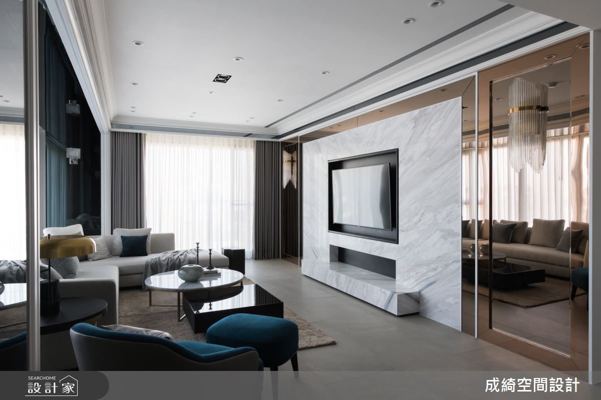來自成綺空間設計的70坪現代風住宅案,屋主一家人共有2位大人、1位小孩,是一間單層新成屋(5年以下)的兩房格局,設計師藉由建材以線板、鏡子、鍍鈦金屬、烤漆、石材、木地板、壁紙的搭配應用,實現一家人的理想生活。