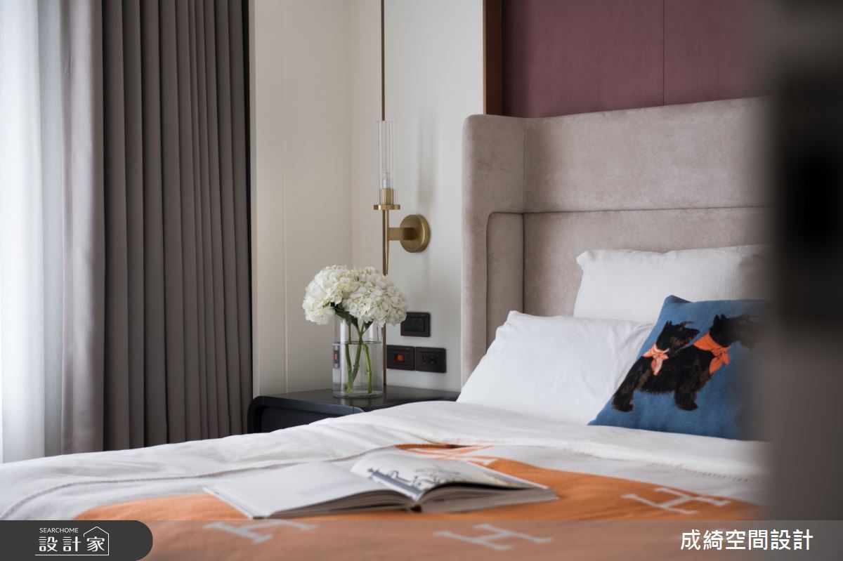 成綺空間設計以油漆、乳膠漆、壁紙、海島型木地板、石英磚/拋光石英磚、鐵件、茶鏡、茶玻、鍍鈦金屬、鋼刷木皮、大理石、磁磚、石材、繃布、噴漆、烤玻的搭配應用,呈現奢華風居家氛圍,將此間52坪、三房、單層、新成屋(5年以下)打造成舒適愜意的家庭空間,完成2位大人全家人的夢想之居。