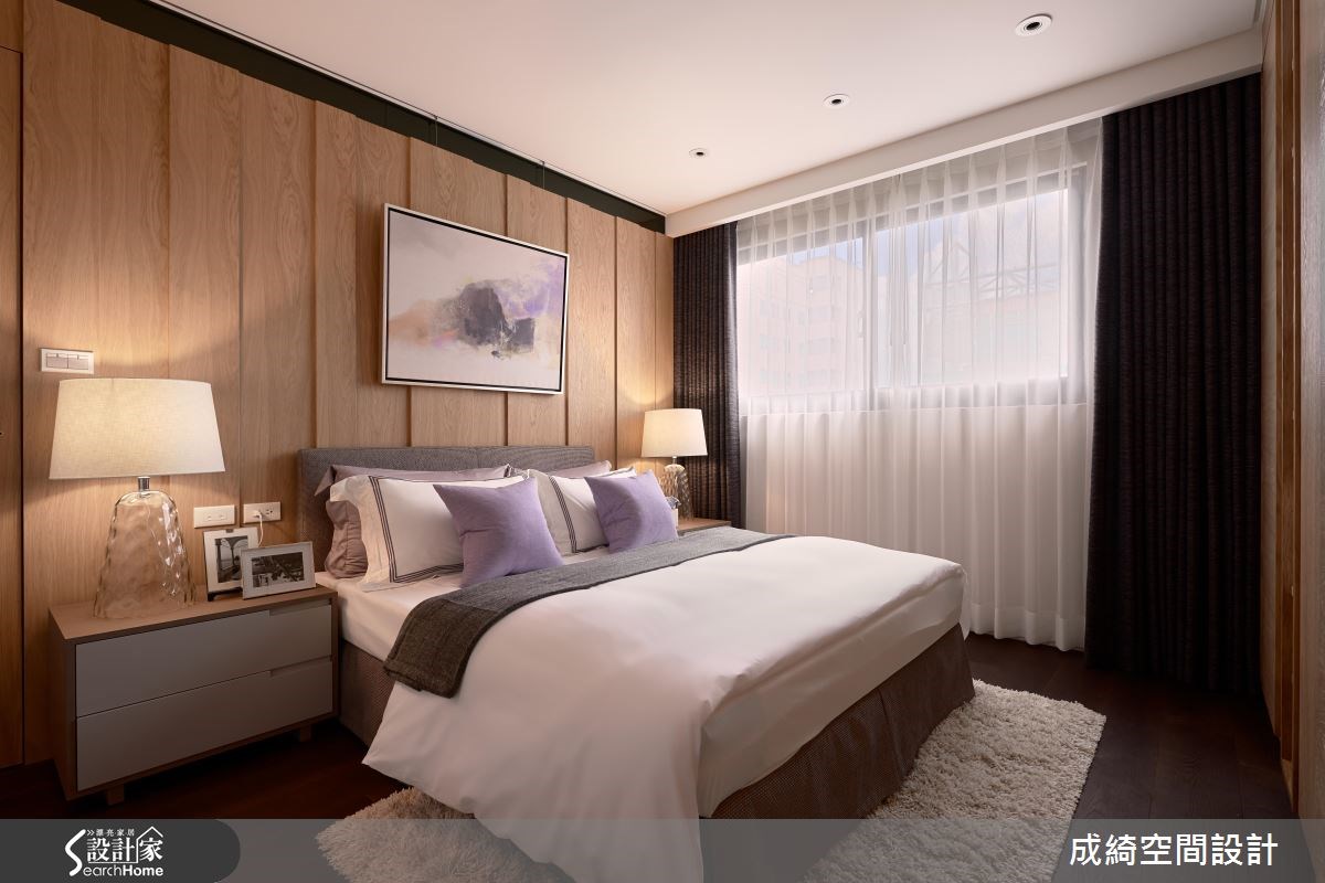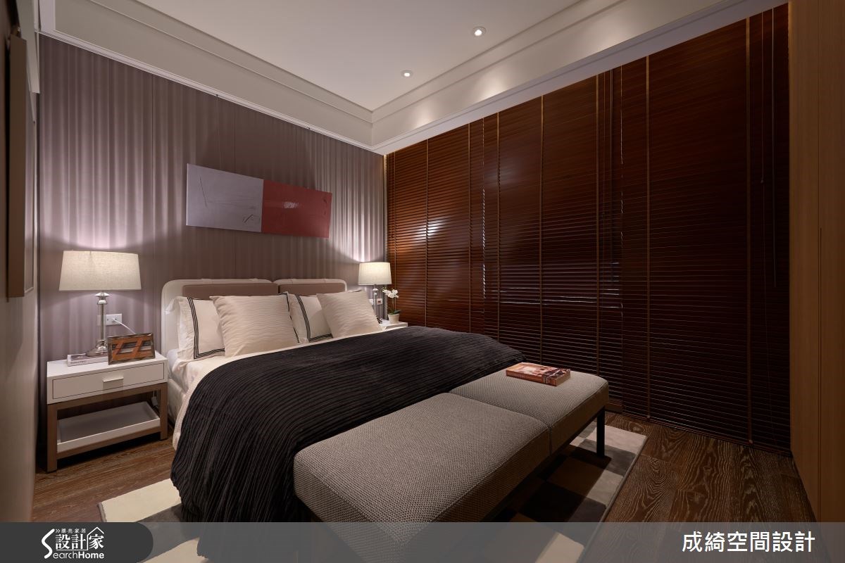 針對預算有限的新婚夫妻需求,設計團隊將木作、硬體的預算降至最低,軟件、家具,並將亮點放在色彩搭配,打造獨一無二的甜蜜基地! 設計團隊把硬裝預算放置於天花與電視牆,利用線條簡約的線板框設天花,接著以沉穩的實木材質俐落排列為俐落的電視牆面,搭配能隨時調節光線的木百葉,創造溫潤不失質感的現代風尚。本案以紫色為主角,呈現在移動式家具、地毯與布藝與畫作,以深淺不一的紫色調打造豐富的視覺層次,更有效減省預算,同時方便日後換房時帶走。設計師更巧妙善用燈飾,以線條繁複、帶著金屬質感的燈飾,創造宛如美術館的藝術質感。 小編的最愛 男主人認為,「婚姻是另一種浪漫的開始,這個家就是兩個人的浪漫基地」。臥房以幾何圖形為造型,搭配紫色軟件,打造全然浪漫氛圍!