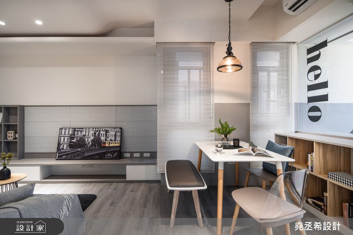 來自堯丞希設計的18坪現代風住宅案,是一間單層新成屋(5年以下)的兩房格局,設計師藉由建材以壁紙、石材、噴漆、木皮、金屬、玻璃、壁布的搭配應用,實現一家人的理想生活。