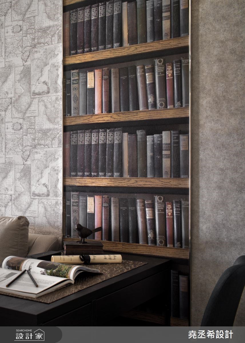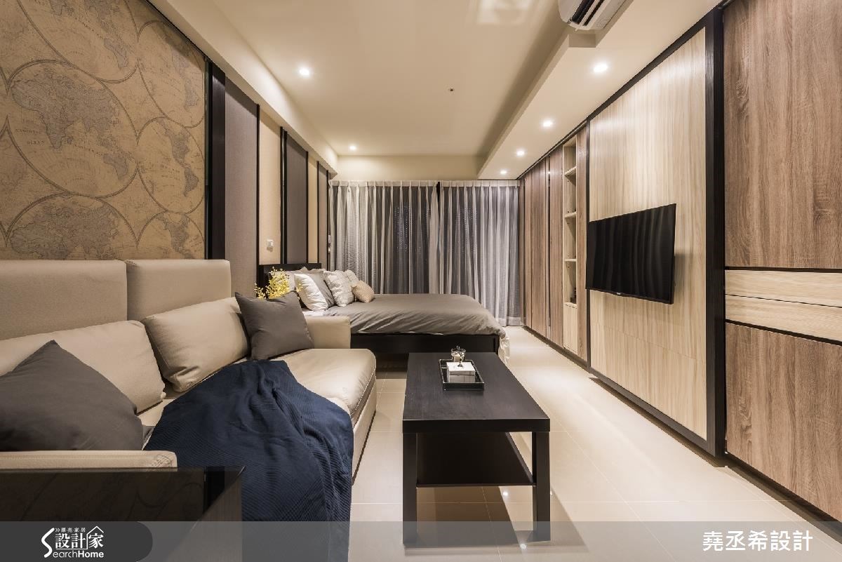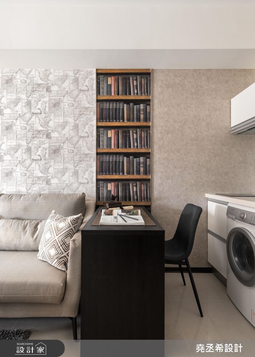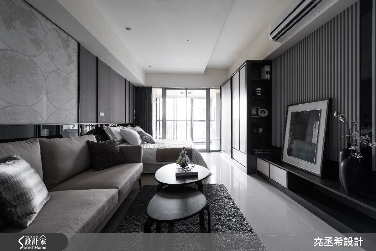 在10坪的小宅裡,以簡約感的黑灰白色調構成居家風格,直條紋的層次立面、局部以鏡面質材點綴,輕灑低調的時尚美感。 由於空間較小,原本遇到入室穿堂的窘境,而當玄關處打造一面局部穿透、開放層架式的鞋櫃後,巧妙解決此問題,不但開門時避免一眼望見臥房,適當的鏤空設計,讓戶外的光源能夠延伸到玄關處,創造景深,同時也滿足居家機能,內外領域自然界定。整體空間利用垂直水平的黑色線條串連,巧妙劃分出領域機能,同時呼應簡約的風格特質,電視牆以立體感溝縫描繪,右側壁面結合層板、城市造型的壁紙以及鏡面,異材質的結合讓簡潔乾淨的氛圍之中,譜下豐富的視覺層次;沙發領域則以地圖壁紙鋪陳牆壁,勾勒出優雅大器之感,並藉由壁紙風格的轉換,切換成休憩的臥室環境,開放的動線安排,醞釀舒心、自在的好感生活。 小編的最愛 簡約色調描繪出現代風尚,透過線條、材質、壁紙的轉換,在微型居家空間裡也能勾勒出完美格局。