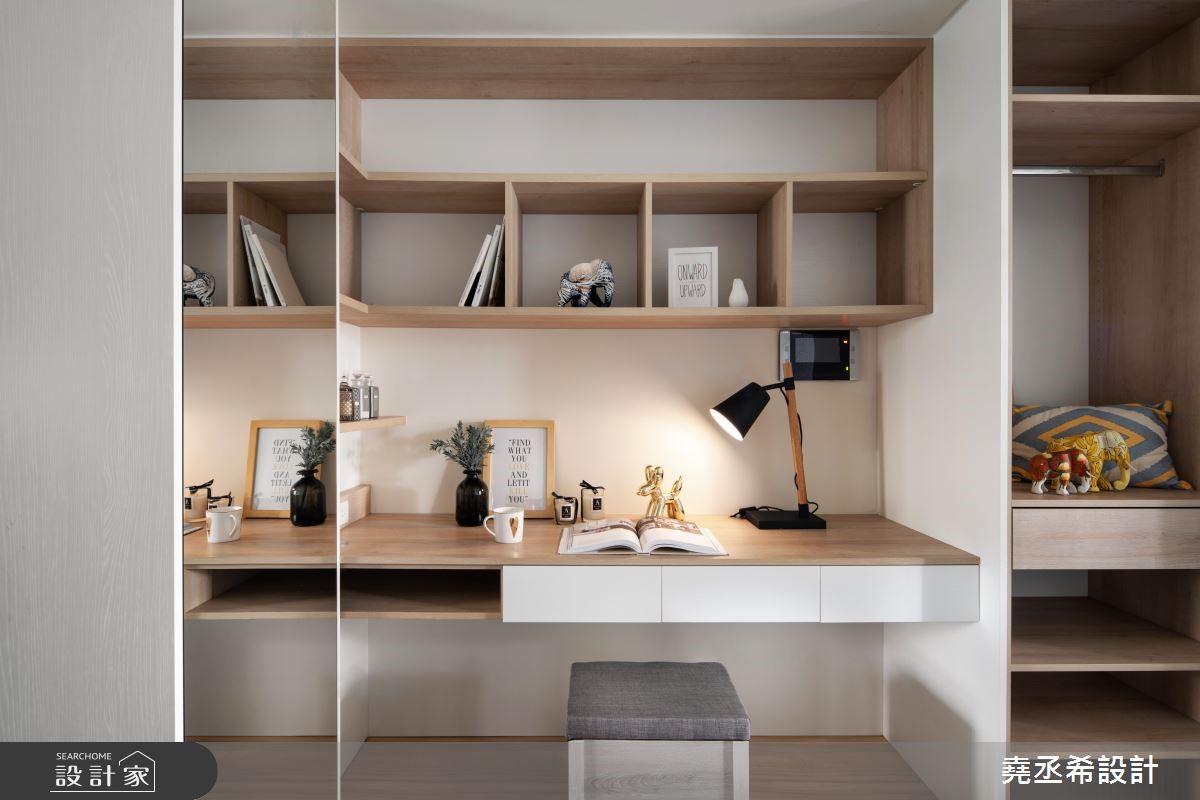 小資女的 10 坪長型迷你宅,以明亮北歐風為主軸,首先使用原木質感與純白色調染出紓壓氣息,再利用吸睛的紅鶴圖樣特色壁紙,搭配文化石紋牆、幾何拼花圖樣牆穿插,製造簡約中的細節層次,而紅鶴壁紙以低彩度呈現方式,凸顯紅鶴圖樣特色,點綴恰如其分的女生住宅氛圍。格局設定上,將睡眠區規劃在空間底部,提升睡眠隱私,而電視牆設置於滑門上的巧思設計,打造出結合衣櫃門片、書房門片意象,並善用其機動性,讓屋主在睡眠區或客廳區皆能擁有最佳觀影享受,發揮小空間坪效。