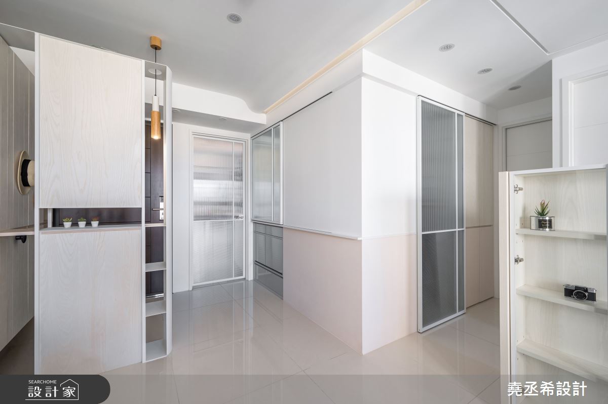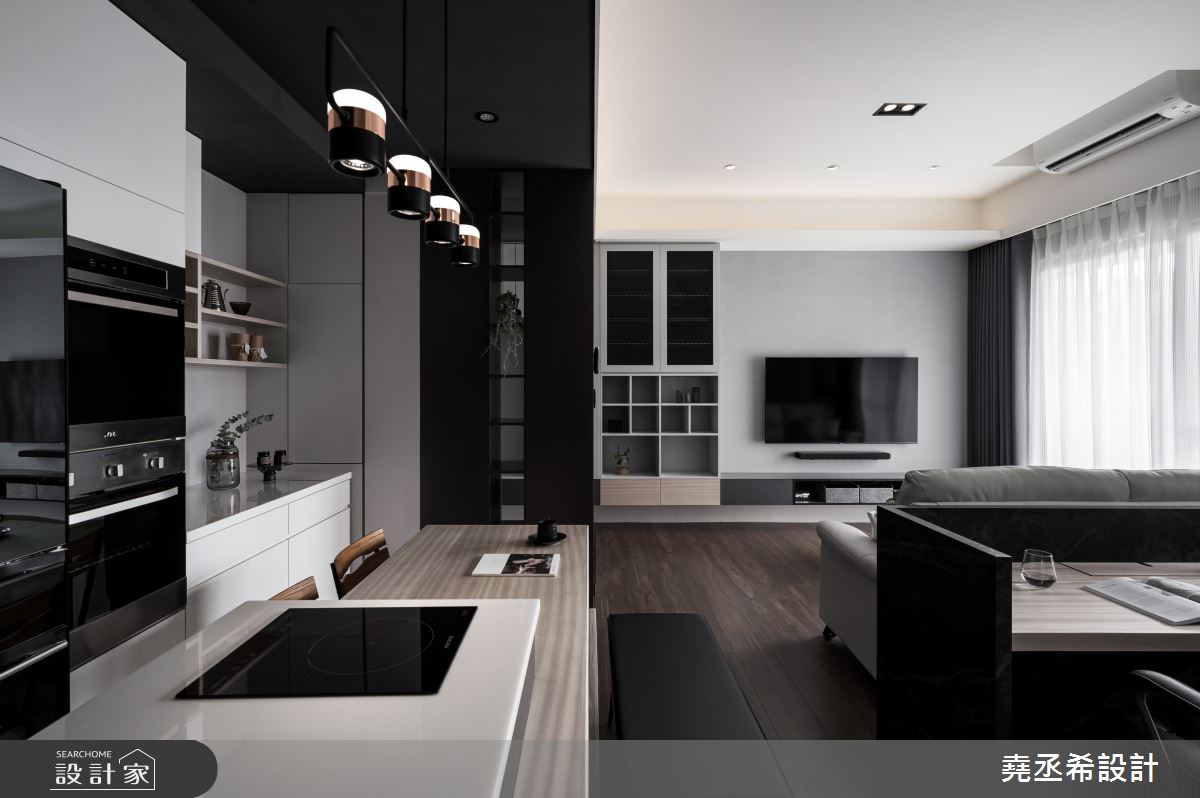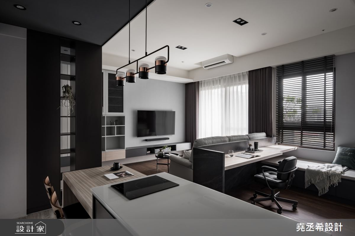 來自堯丞希設計的18坪現代風住宅案,是一間單層新成屋(5年以下)的兩房格局,設計師藉由建材以壁紙、石材、噴漆、木皮、金屬、玻璃、壁布的搭配應用,實現一家人的理想生活。