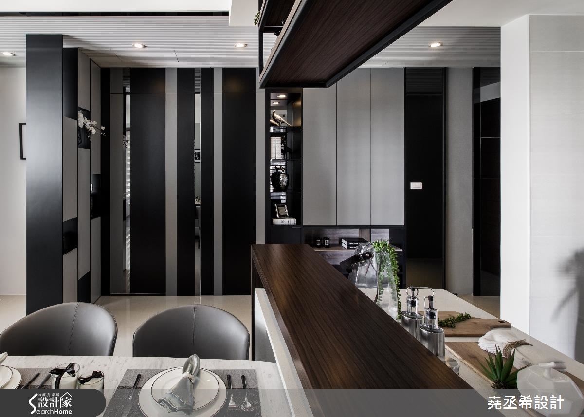 在10坪的小宅裡,以簡約感的黑灰白色調構成居家風格,直條紋的層次立面、局部以鏡面質材點綴,輕灑低調的時尚美感。 由於空間較小,原本遇到入室穿堂的窘境,而當玄關處打造一面局部穿透、開放層架式的鞋櫃後,巧妙解決此問題,不但開門時避免一眼望見臥房,適當的鏤空設計,讓戶外的光源能夠延伸到玄關處,創造景深,同時也滿足居家機能,內外領域自然界定。整體空間利用垂直水平的黑色線條串連,巧妙劃分出領域機能,同時呼應簡約的風格特質,電視牆以立體感溝縫描繪,右側壁面結合層板、城市造型的壁紙以及鏡面,異材質的結合讓簡潔乾淨的氛圍之中,譜下豐富的視覺層次;沙發領域則以地圖壁紙鋪陳牆壁,勾勒出優雅大器之感,並藉由壁紙風格的轉換,切換成休憩的臥室環境,開放的動線安排,醞釀舒心、自在的好感生活。 小編的最愛 簡約色調描繪出現代風尚,透過線條、材質、壁紙的轉換,在微型居家空間裡也能勾勒出完美格局。