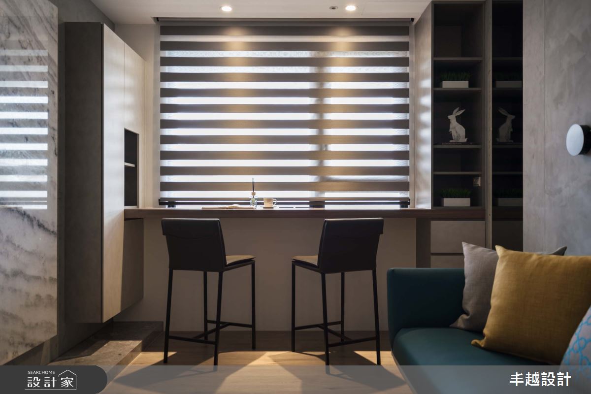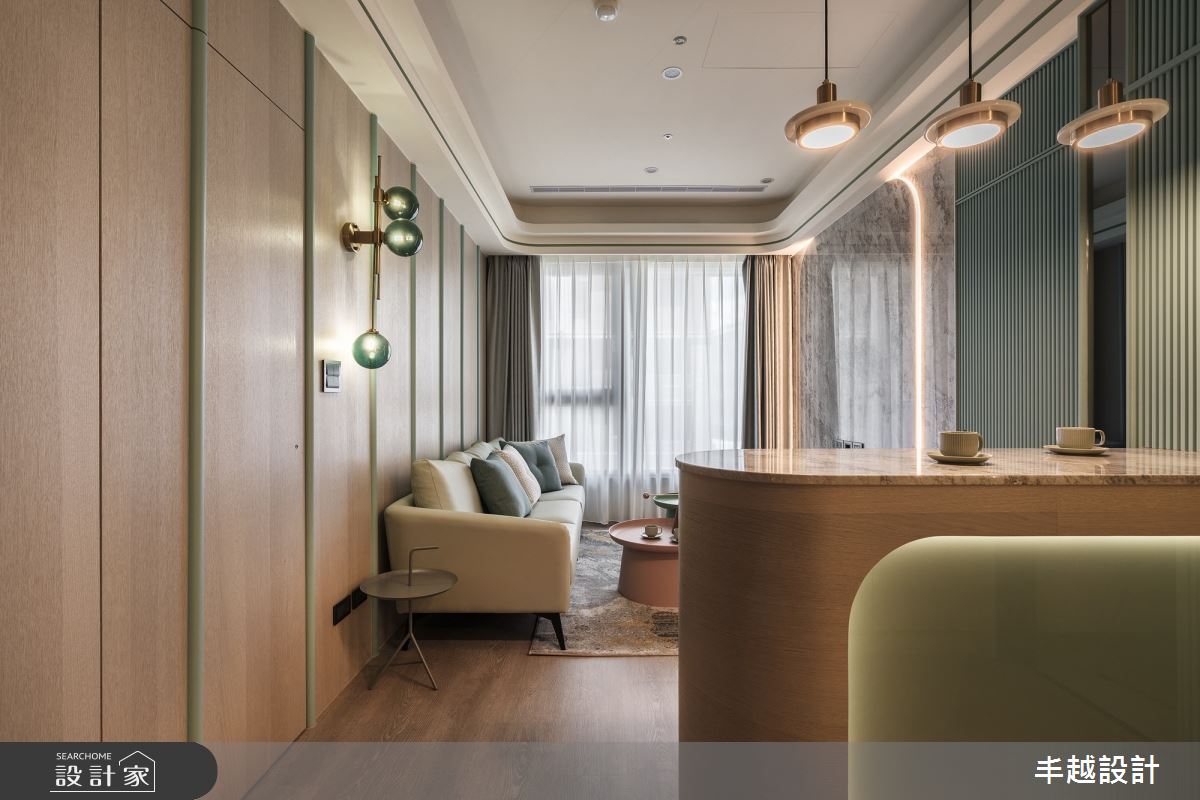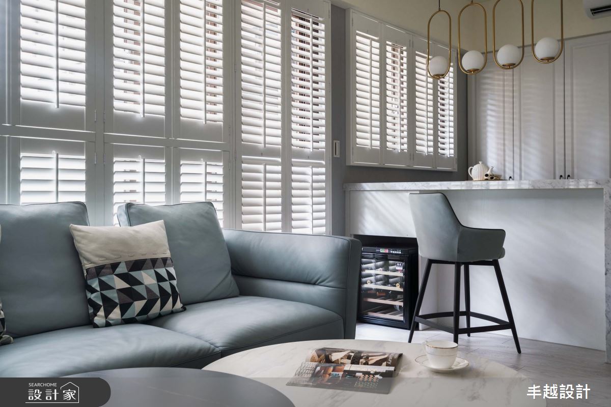丰越設計以烤漆、線板、天然石材、實木百葉、鋁框、萬向門的搭配應用,呈現混搭風居家氛圍,將此間18坪、兩房、單層、新成屋(5年以下)打造成舒適愜意的家庭空間,完成2位大人全家人的夢想之居。