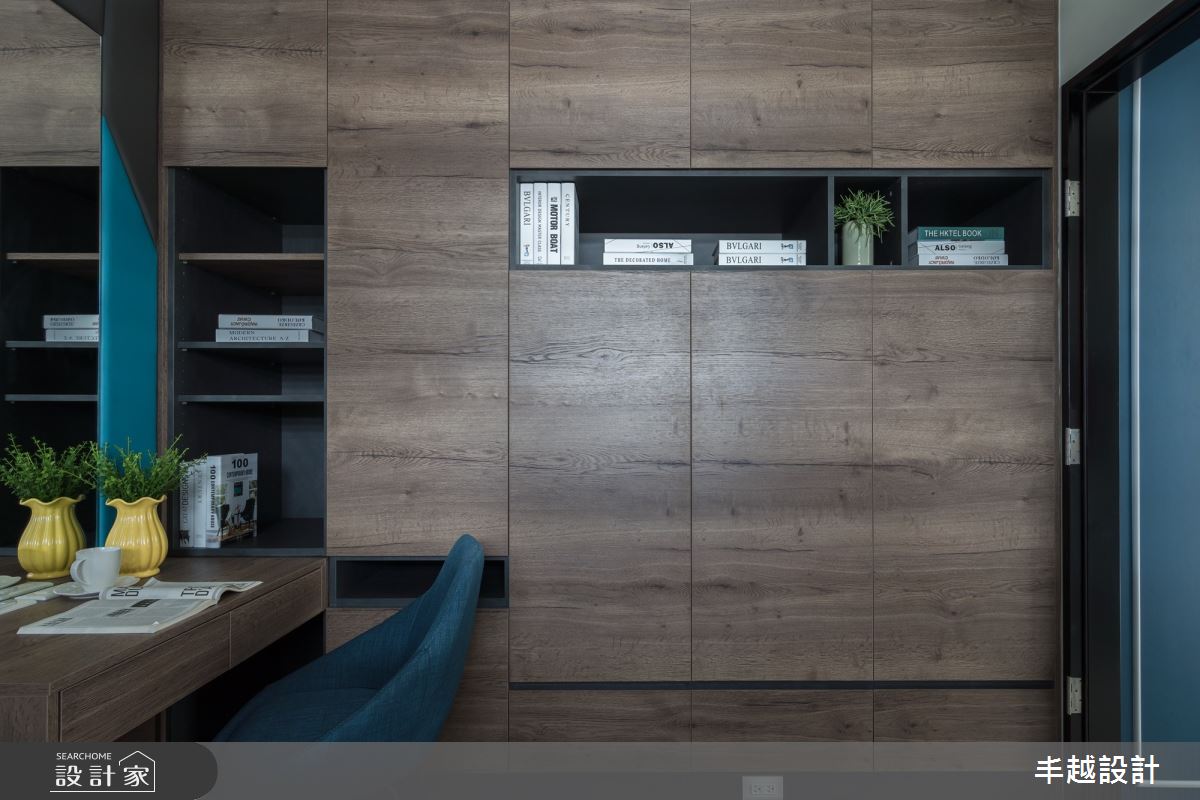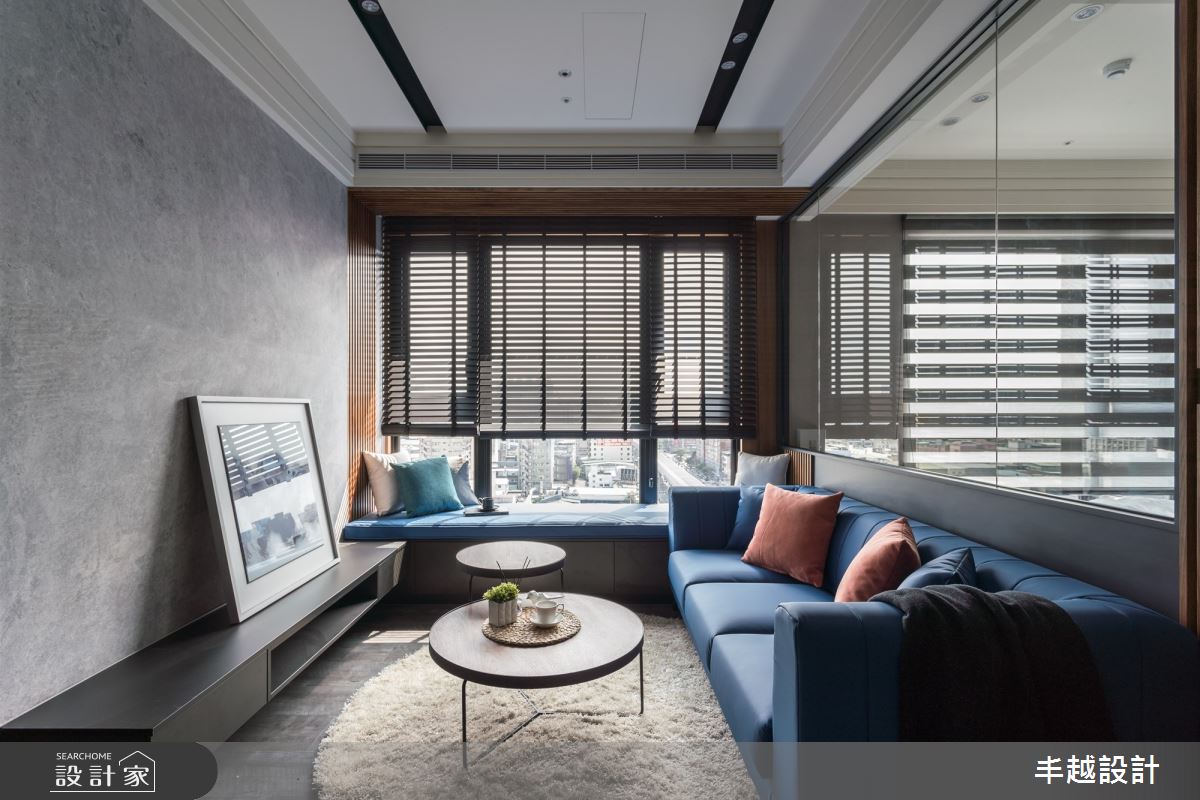 27 坪現代宅以木皮、鐵件、玻璃等各種建材的混搭,營造出沉穩舒適的室內氛圍,讓人一踏進家門就能放下煩惱,調節繁忙的生活步調。客廳選擇仿古面大理石,配合靠窗處的木格柵,緩解石材帶來的視覺重量,且將視線帶到與沙發同色系的臥榻區,賦予屋主一處享受城市景緻的悠閒場域。而藍色沙發跟珊瑚橘抱枕的色彩配置,也點亮整個沉穩空間。在通往私領域的走廊,設計師利用鐵件和玻璃材質減輕木櫃的分量感,無論是層層酒櫃或是收藏展示架,都能表現屋主的喜好與品味。主臥床頭牆運用黑色線條,分割原木色與灰色色塊,給人一種幾何抽象的藝術感,而 L 型書桌則把靠近床頭處的桌角導圓,避免撞傷的危險。次臥透過玻璃隔間串聯起客廳採光,加上床旁的玻璃門片收納櫃,讓空間看起來更為明亮開闊。