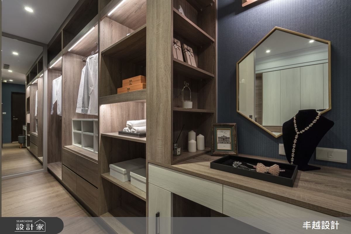 41坪的混搭風宅邸,設計師以淺色與褐色為主調,並巧妙融合新古典與現代風格,打造低調卻帶有奢華感的居家氛圍,住在其中彷彿感受濃郁的英倫優雅生活。 一進入室內,映入眼簾的是餐桌後方牆面的圓形大理石裝飾,其以金屬鑲出細膩花瓣,不僅是用餐時的點綴亦是入門後的美妙端景。客廳電視牆以白色天然大理石鋪陳並與茶几檯面相互呼應,並在其中加入玫瑰金色元素,在恢宏氣度中流露雅致情調。沙發後方以半牆界定書房空間,半開放式的設計與展示櫃兩側利用照明營造漂浮感也讓空間視覺尺度得以放大。 旋入主臥,延續公共空間的淡色與金屬框線的優雅,賦予舒適恬靜的睡眠場景,而因為床底與衣櫃的寬度較窄,設計師特別利用玻璃推拉門,透視的衣物收納空間展現主人的個性也令房內空間更顯寬敞。 小編的最愛 主臥內的衣櫃運用玻璃門片,讓原本窄小的房內空間瞬間放大。