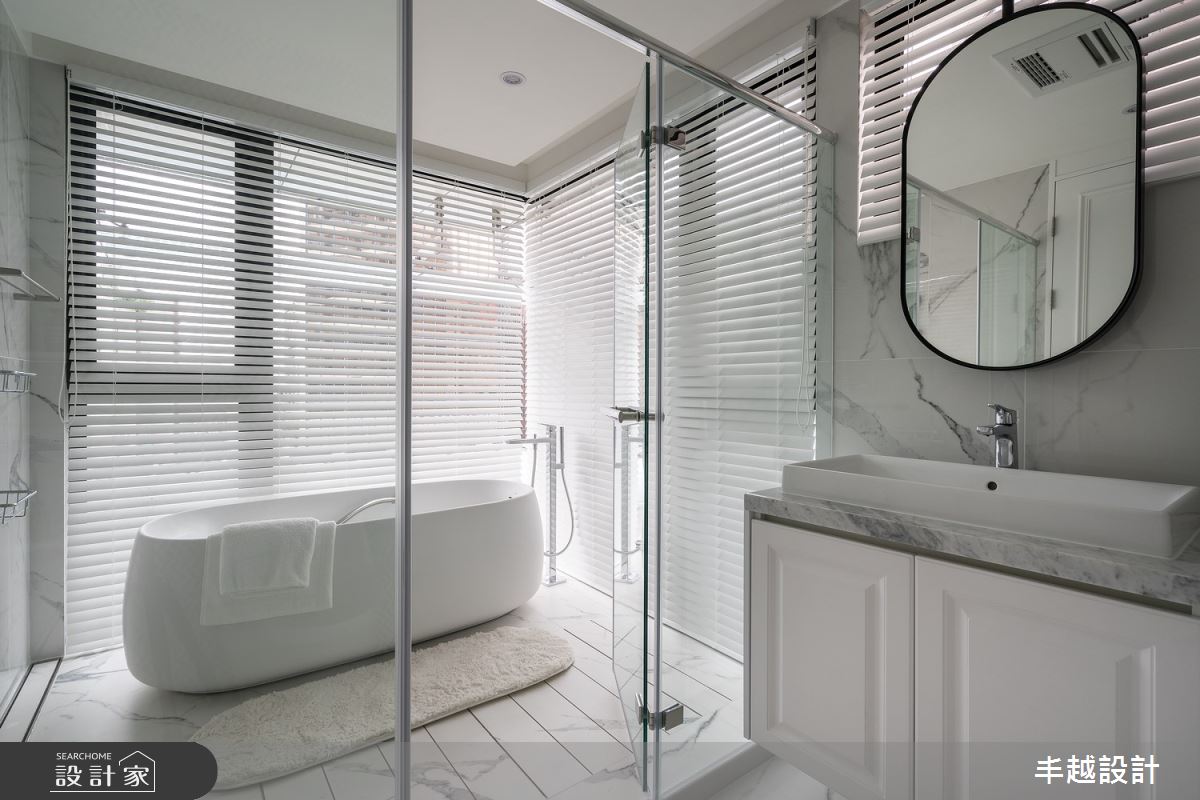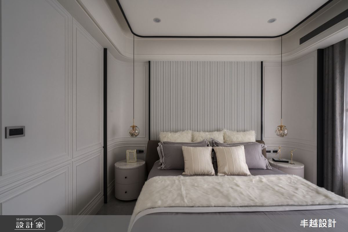 丰越設計以油漆、乳膠漆、壁紙、石英磚/拋光石英磚、鐵件、灰鏡、鍍鈦金屬、大理石、木百葉、賽麗石、皮革、石材、繃布、線板、噴漆的搭配應用,呈現新古典居家氛圍,將此間35坪、三房、單層、新成屋(5年以下)打造成舒適愜意的家庭空間,完成2位大人全家人的夢想之居。