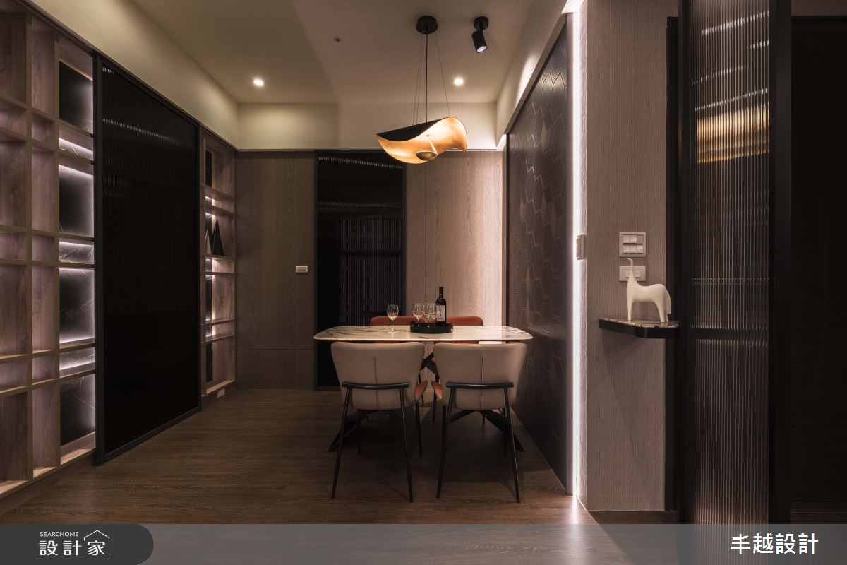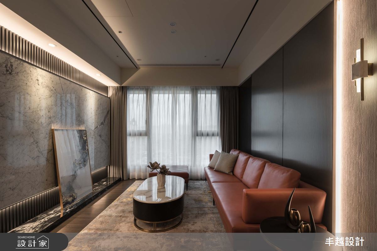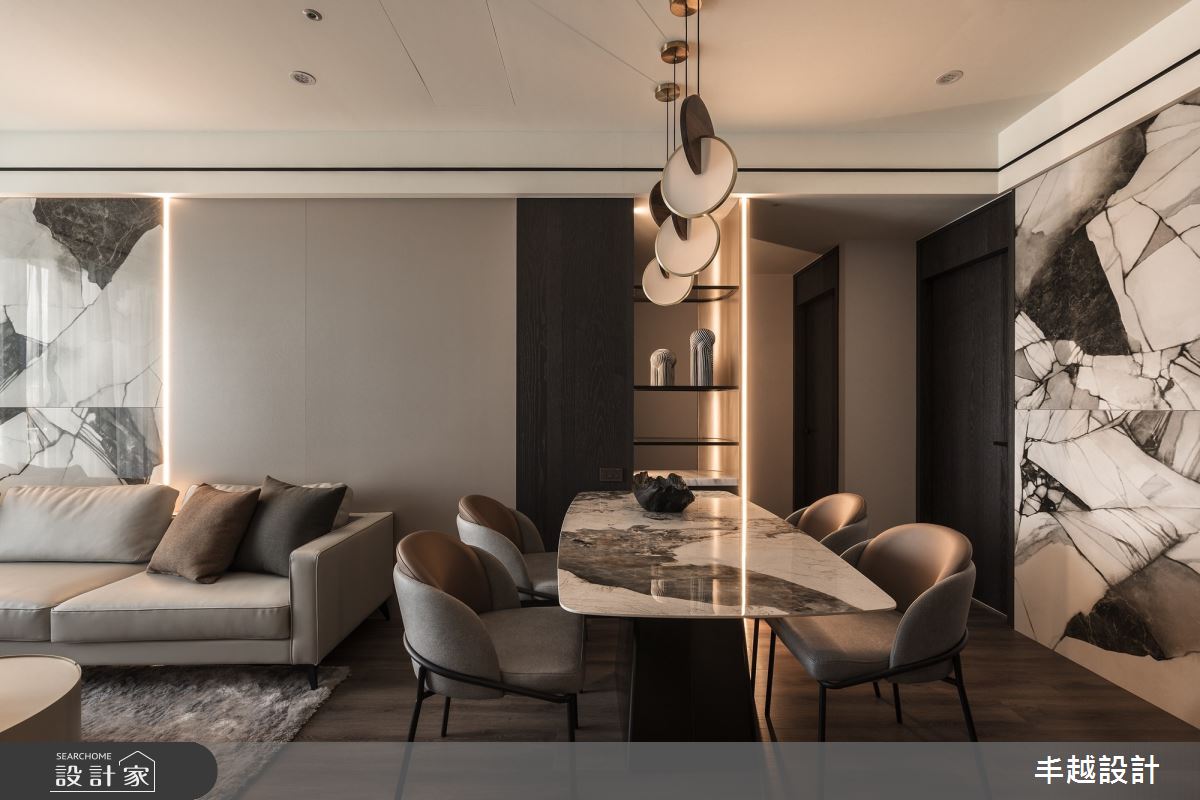 丰越設計以進口磁磚、天然大理石、皮革、線燈的搭配應用,呈現奢華風居家氛圍,將此間16坪、三房、單層、新成屋(5年以下)打造成舒適愜意的家庭空間,完成全家人的夢想之居。