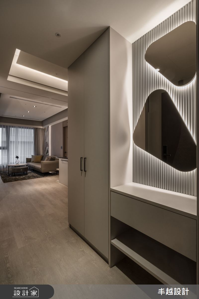 丰越設計以烤漆玻璃、噴漆、SPC木地板、格柵板的搭配應用,呈現奢華風居家氛圍,將此間12坪、兩房、單層、新成屋(5年以下)打造成舒適愜意的家庭空間,完成全家人的夢想之居。