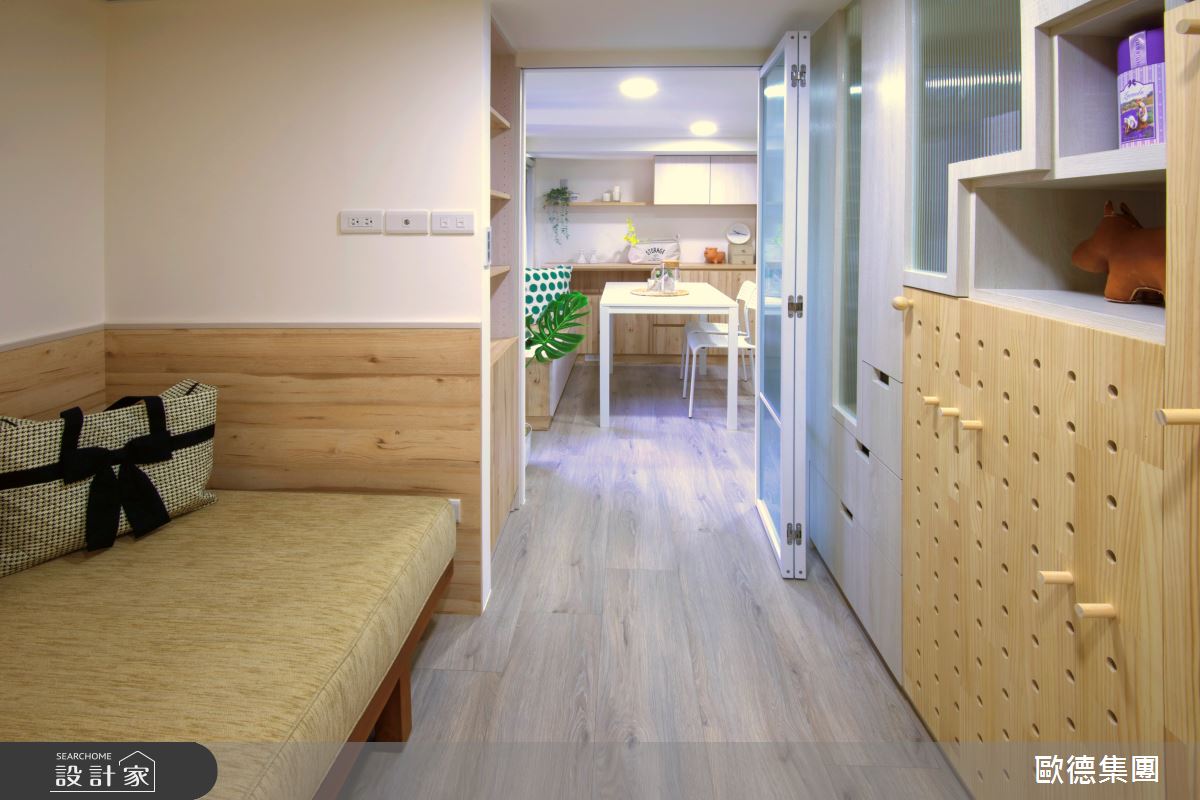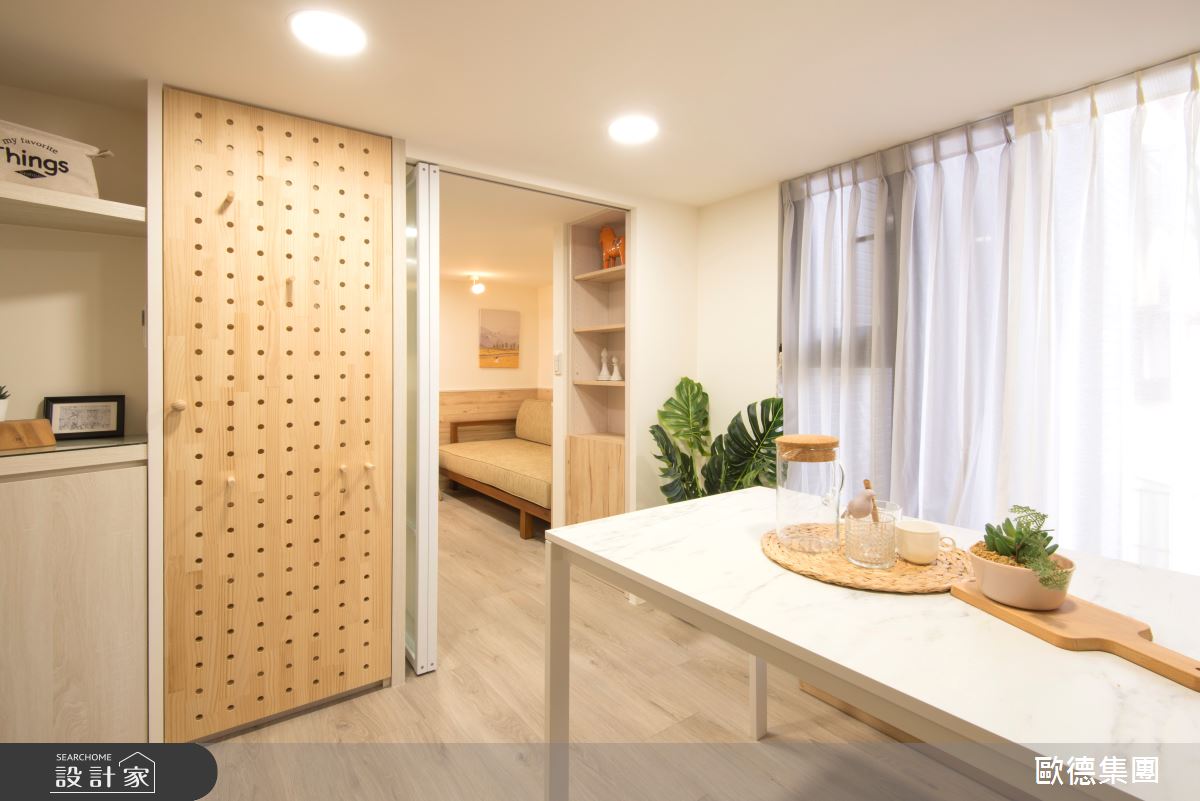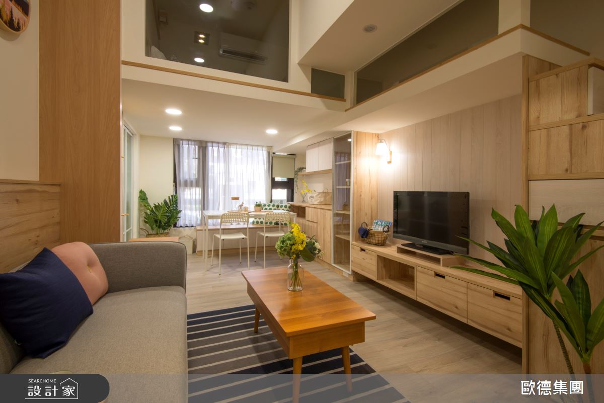 本案為歐德傢俱設計團隊的18坪休閒風新成屋(5年以下)設計作品,格局為夾層三房的居住空間。居住成員包含2位大人、1位小孩。全室建材的搭配,應用優渥系統櫃、洞洞板、鐵件折門、超耐磨木地板,展現溫馨的居家氛圍。