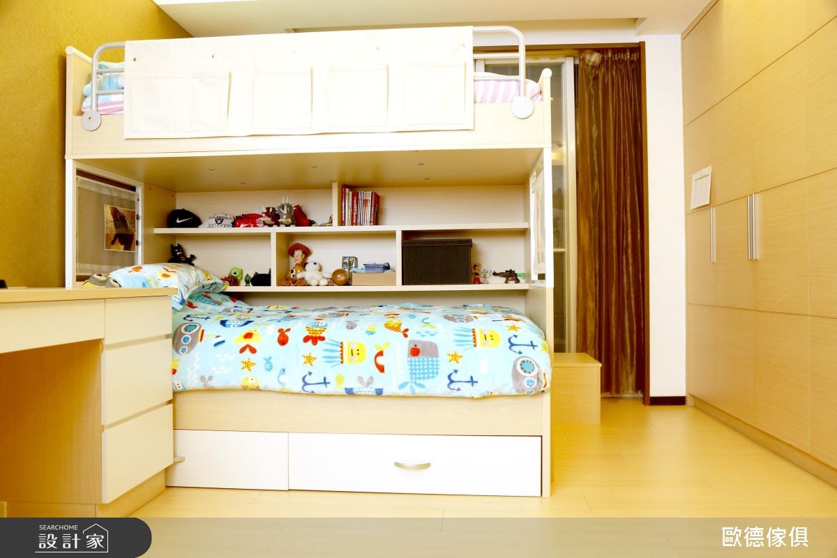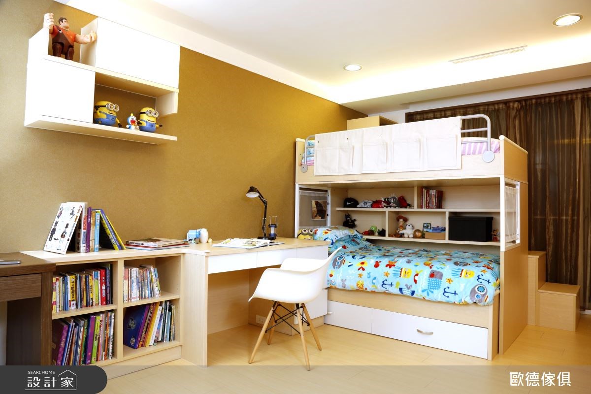 藝人夫妻檔阿 Ben 與小可擁有 3 個可愛的孩子,為了給予孩子們健康無憂的成長環境,在群山環繞的市郊買下 120 坪的透天厝,同樣選用以環保、抗敏為宗旨的歐德團隊打造新家。 一樓公領域為一家人最重要的歡聚地點,由於夫妻倆喜歡簡單俐落的風格,設計團隊以原木色系書櫃結合客廳電視牆,平衡灰階色調帶來的冷調感受、打造開放式遊戲間,成為幼子們閱讀、嬉遊的小天地,也方便爸媽照看。一旁餐廚空間的櫃體結合吧台、收納與展示機能,讓夫妻倆隨時小酌怡情,更能因應親朋好友的歡聚需求、串連客廳餐廚空間。重視孩子們睡眠安全的夫妻檔,以孩子的意見為主,設計師選用明亮活潑的黃綠色調結合收納櫃與床組,在下層空間放上床墊,讓父母參與孩子的作息。另外,由於藝人有著大量造型搭配需求,因此設計師在入門處設置大片收納鞋櫃,讓百雙鞋得以有著充裕、一目瞭然的展示空間。 小編的最愛 歐德傢俱兒童床有著防撞設計與安全把手、緩衝滑軌等機能,並以大面積階梯取代直立式樓梯,大幅降低踩空、摔傷的危險,在在皆為了孩子的安全為考量為宗旨。