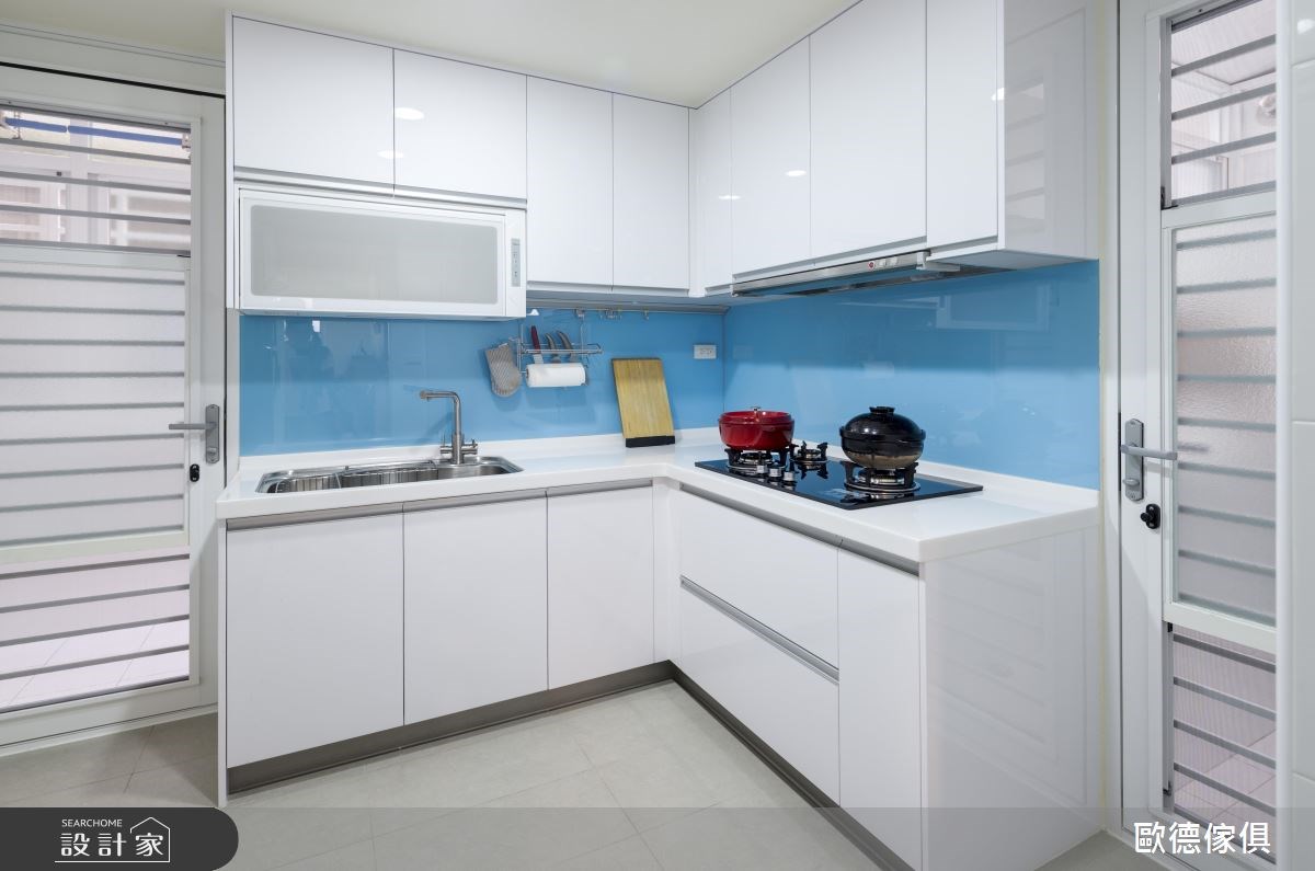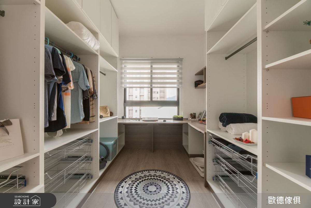 本案為藝人鍾欣怡與製作人老公孫樂欣的新居,餐廳區域以實用、耐看的白色系作為主,餐櫃上方運用鐵件、系統板材點綴,簡練卻有設計感,並在較低的櫃體部分採用無把手門板,避免小孩碰撞受傷;主臥以土耳其藍搭配咖啡紅豆杉系統板材,創造極具個人風格的臥房視野,且特地規劃整面收納牆,下半部收納生活用品,上半部則以開放方式呈現,可依需求調整層板高低,創造不同氛圍;並設計較寬較深的化妝桌,即使兩人並肩而坐也不會感到壓迫,鏡面於上、下方打上燈光,讓使用上更方便,玻璃層板櫃體則讓物品可被整齊收納,窗邊的臥榻,兼具了休憩與收納機能,以桃紅色坐墊塑造活潑氣息。