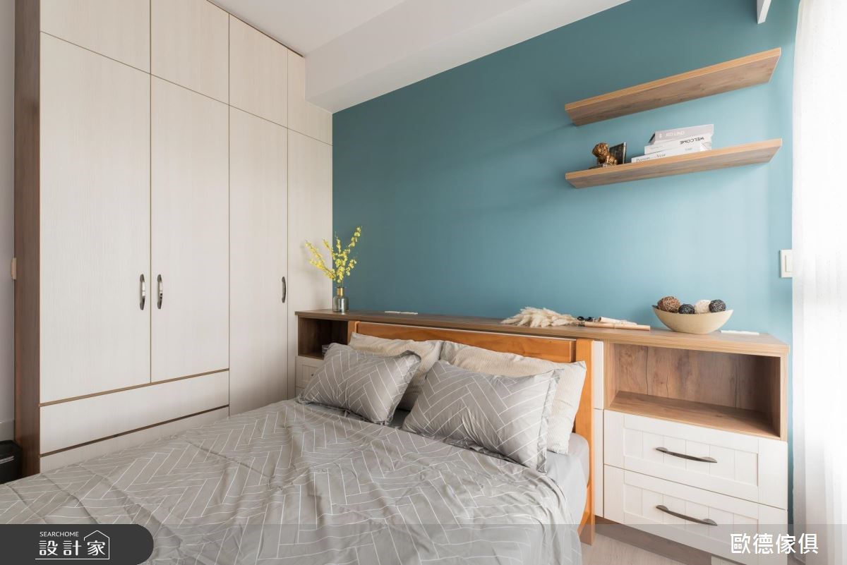 本案屋主為年輕的醫生夫妻,注重無毒健康環保,設計師於客廳採用仿石材板的系統板面,創造有如大理石牆的質感;且因應未來人生規畫,預先準備了小孩房空間,選用舒服的水藍色牆作呈現,並搭配高收納機能,也幫長輩準備了溫馨有質感的長親臥房;主臥部分,選用歐德綠建材床墊,而除了打造女主人的更衣間外,也考量男女主人下班後偶爾在家辦公的習慣,增設書桌場域,主臥的床頭壁面,同樣加入系統板材做造型變化,電視牆、浴室門也選擇系統板材作呈現,兼具美觀與實用性。