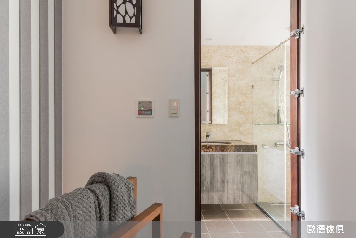 50 坪大宅,設計師善用各式質材,如文化石、樂土、鐵件等建材,搭佐系統家具運用及客製化設計,不只創造出理想生活情境,也兼顧到長輩與小孩的無障礙設計,快跟著小編一起來看看吧! 玄關區,於天花加入隔柵美化視野,並利用木作規劃 L 型穿鞋椅,搭配系統家具鞋櫃配置,滿足機能使用,邊角處,則細心做出圓弧導角防止碰撞、照顧到家中老小的行進安全;客廳,於白色文化石鋪鋪陳電視牆,以樹枝造型美化表情,並隱去左側房門入口,形成充滿美感的立面風貌,沙發後方以系統板材打造整面書牆,立體感十足,同時結合電腦桌擺放,利用板材的可迅速拆卸、重複利用的便利性,形塑彈性使用情境;餐廚區域,安排實用中島餐桌,於下方置入電器櫃收納空間,完善整合機能,旁側牆面則刷上深綠色乳膠漆,搭配木質展示層架,營造視覺美感;主臥內,以德國進口低甲醛板材規劃一切可見收納,讓起居使用更為安心,床頭則因存有壓樑問題,於底下設計上掀式收納櫃,解決風水問題並增添實用功能! 小編的最愛 為了延續整道牆的連貫美感,主臥內,將浴室連結衣櫃,透過大面積的綿延立面,虛化通道的存在,使視覺更清爽!