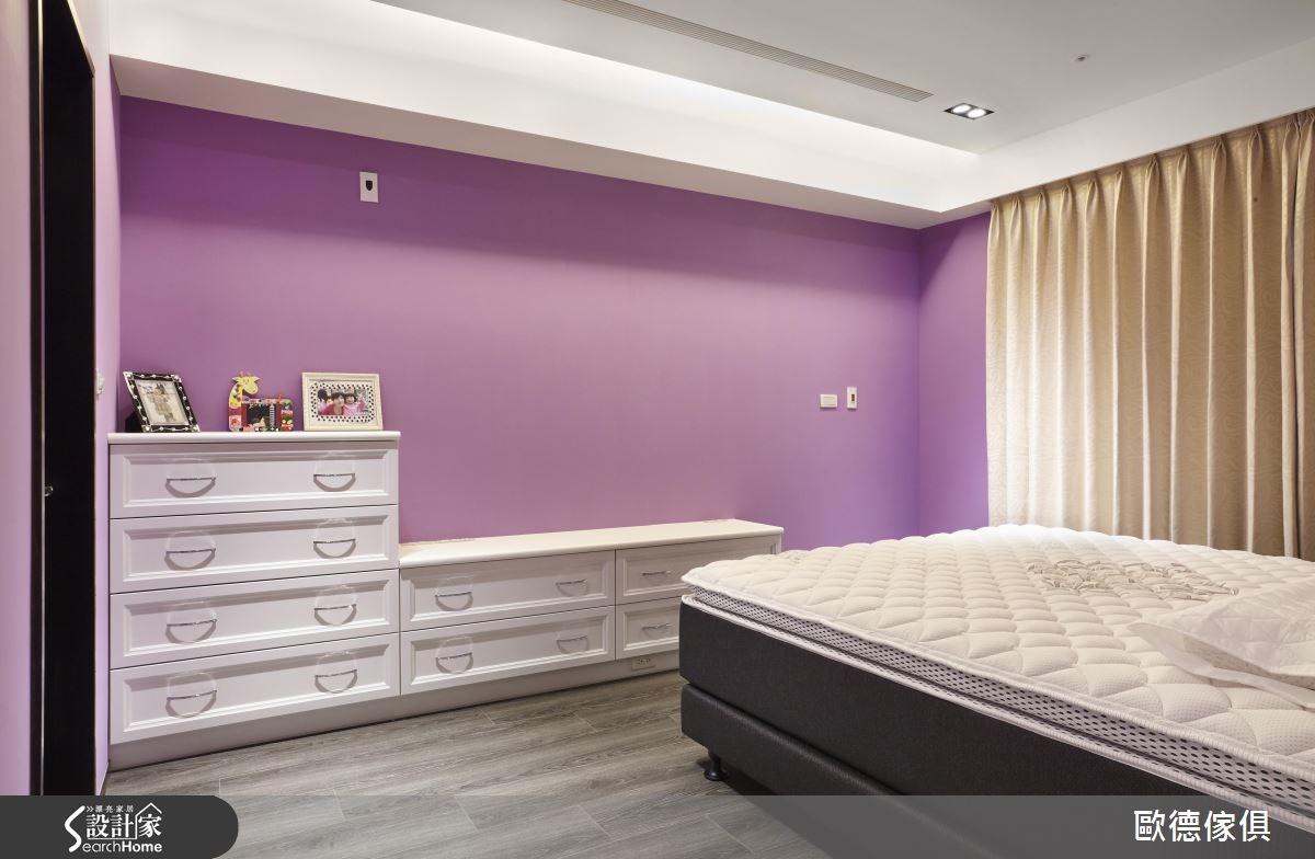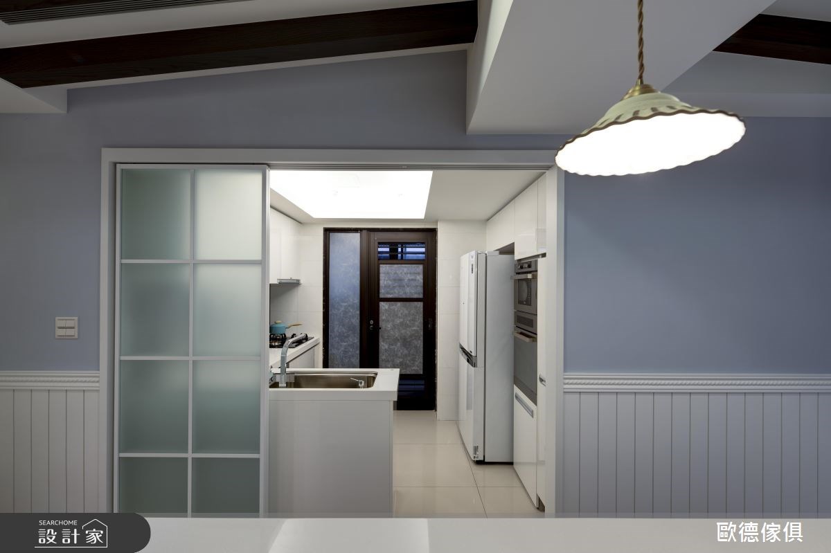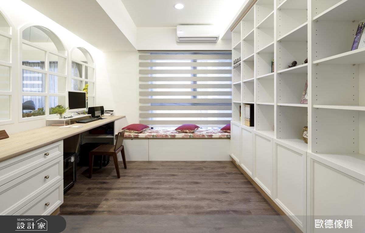 40 坪居家,設計師以鄉村風作為基底,在客廳與書房之間隔間牆做出巧思設計,運用圓弧語彙打造三扇室內窗,呼應鄉村風的經典造型,同時也利用窗台深度、作出讓屋主陳列收藏品的展示空間,書房兼具臥榻主題,充滿著居室的使用概念,讓屋主可在此看書或辦公,並可同時坐擁一個休憩的角落;餐區則於牆面上揮灑清新的藕紫色,營造輕盈、活潑視覺感受,並考量到餐廳天花板的落差,於上方加入斜格柵修飾格局,帶出溫潤安定的氛圍,且讓中島結合餐桌,做為現成的交際平台,並打造出一處家人凝聚情感的中心;寢臥內,除了挹注強大的收納機能,也著墨於櫃體的線條刻劃,凝聚清爽雅致的風情!