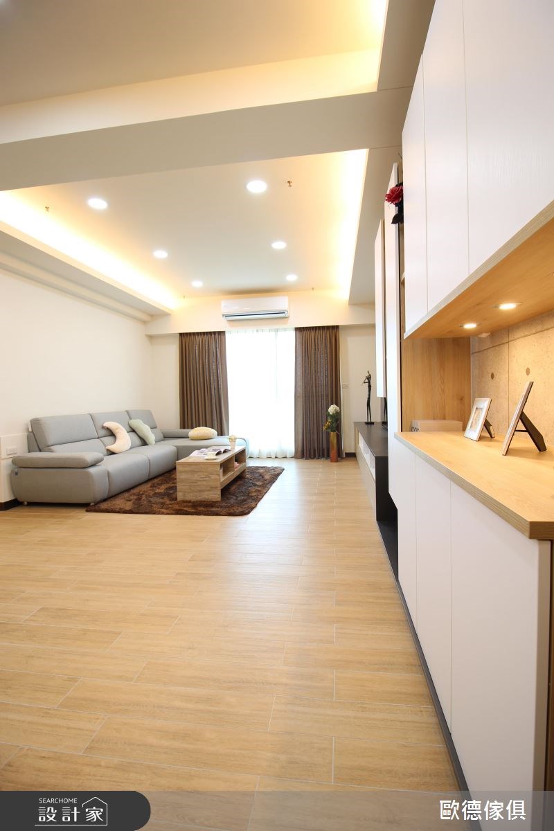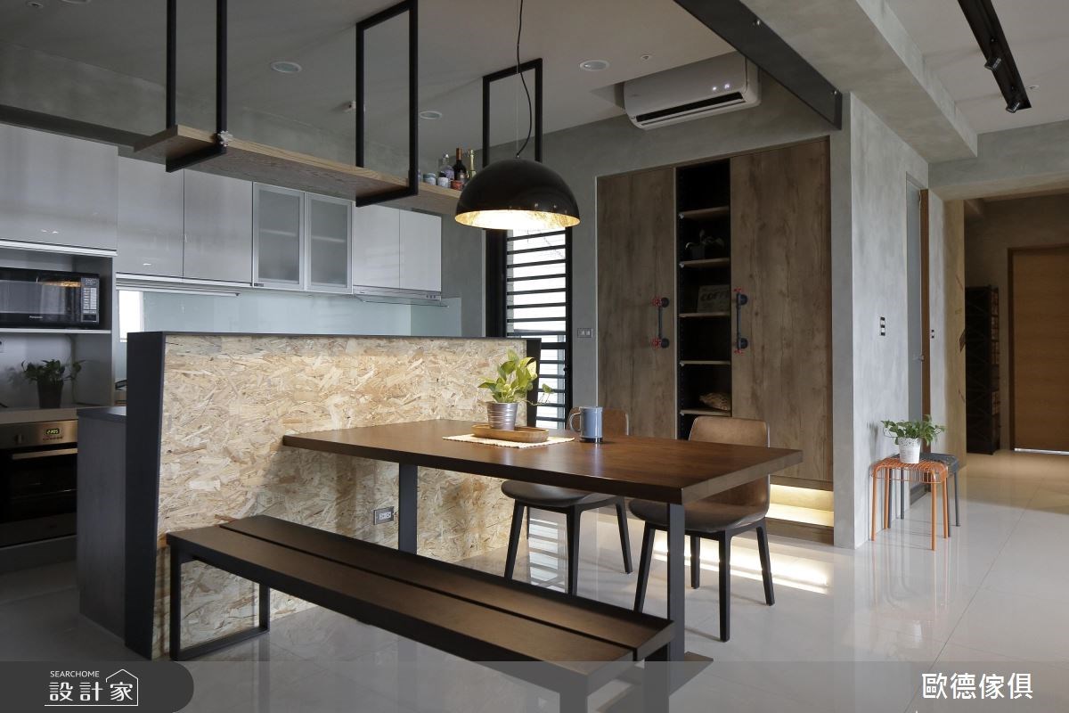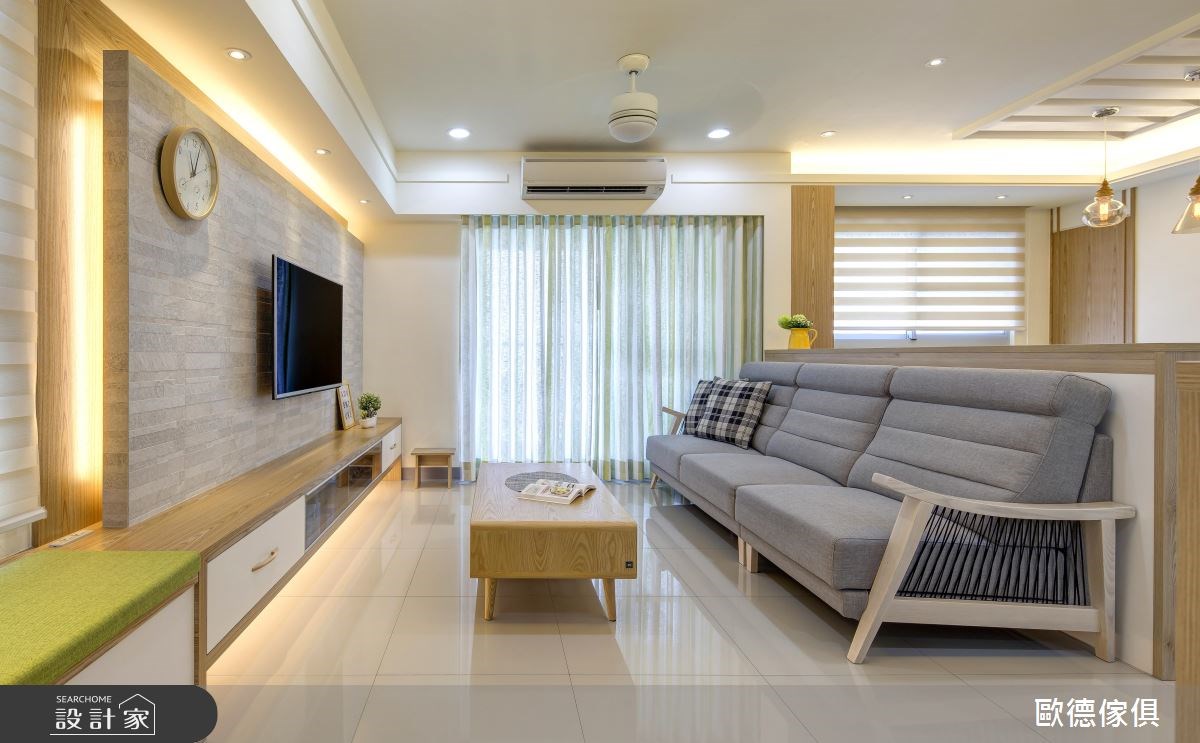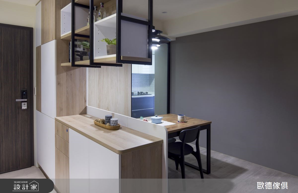 年輕的屋主夫妻面臨小孩剛誕生的喜訊,對於新家的環境特別找上歐德集團予以打造,空間設計上以寬敞明亮為訴求。邵柏凱設計師透過流暢的行進動線做為規劃,結合大面採光的優勢,讓公領域有開闊、放大一倍之感;考量小朋友長大後的日常所需,因此強化收納機能,讓系統櫃在空間裡發揮得淋漓盡致。 仿清水模的矽酸鈣版舖陳壁面,從入口玄關處一路延伸至客廳,穿過幾個收納櫃體,在淺色木紋與白色門扇收納櫃的搭配下,調和出清新、自然的氣息;壁面收納除了一般的鞋櫃,還有懸空的櫃體設計,兼具機能與美感展示的設計手法,令人為之驚豔!淡雅的木紋磚舖敘客廳地坪,空間裡則擺設符合人體工學設計的灰色皮革沙發、木紋茶几,電器櫃與一旁收納櫃造型相互呼應,替室內增添豐富的層次與表情,且調和出人文優雅的美學風範;電視牆以簡約的矽酸鈣版作為基底,無刻意的裝修、保留質材原始風貌,展現樸實、大器之姿。 小編的最愛:第一次走進空間裡,還以為沒有餐桌區,原來貼心的歐德集團將餐桌設計為可收納式,平時可收放在靠牆處的櫥櫃內,讓空間更顯開闊,需要使用時再拿出來即可,完美提升居家生活的坪效使用。